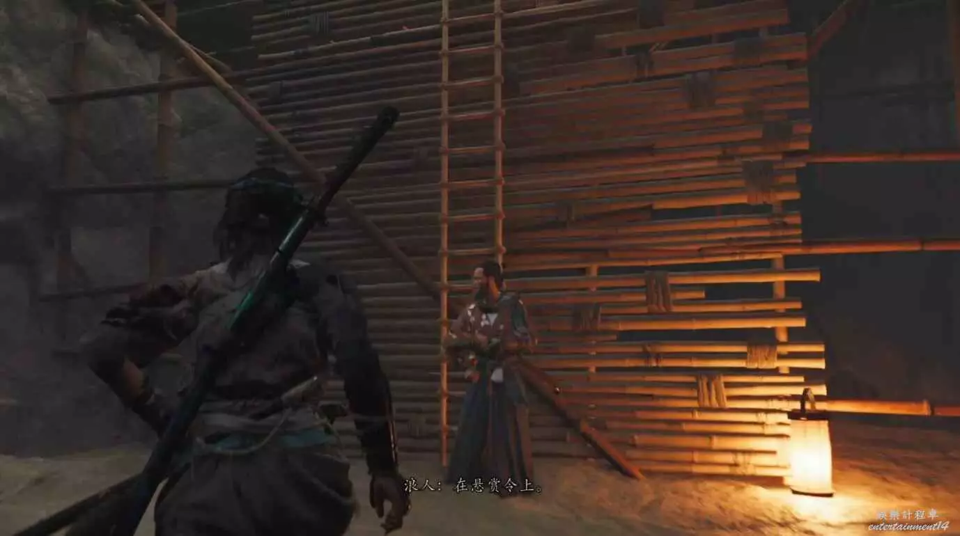 跟著浪人走到木梯前,他發現我們的真實身份,戰鬥結束爬梯子上去。