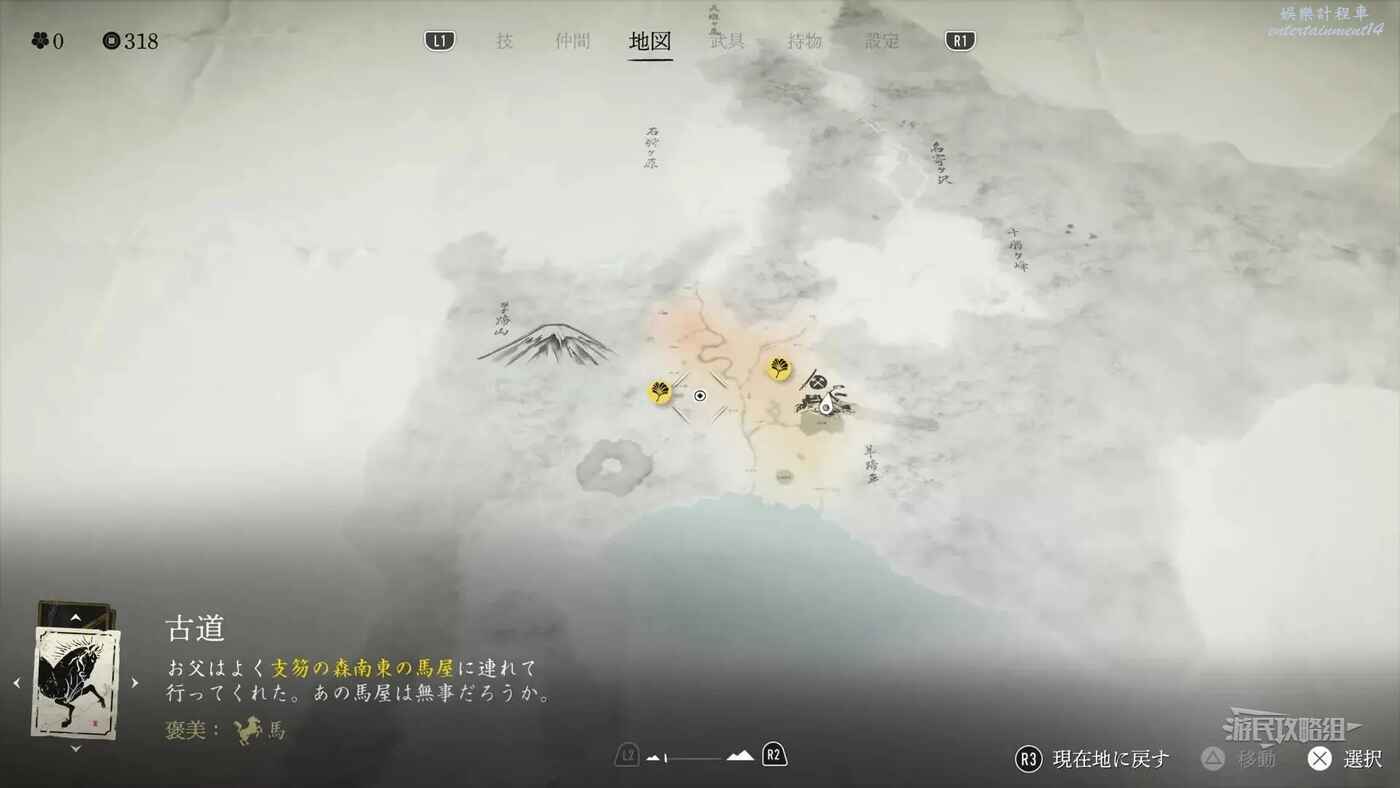 按【十字鍵-左】可召喚馬匹至身邊,靠近後按R2鍵即可騎馬,適合長距離地圖移動時使用。