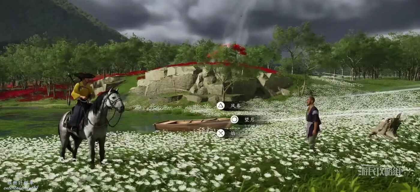 騎馬可大幅提升地圖移動效率。本作的地圖比較大,建議儘早獲取馬匹以縮短行程時間。騎馬經過白色花叢時會觸發加速效果,能進一步縮減移動耗時。另外,靠近馬匹後按【十字鍵-左】可搭建營地,營地包含烹飪獲取增益、休息推進時間等功能。烹飪帶來的增益效果對戰鬥非常有幫助。