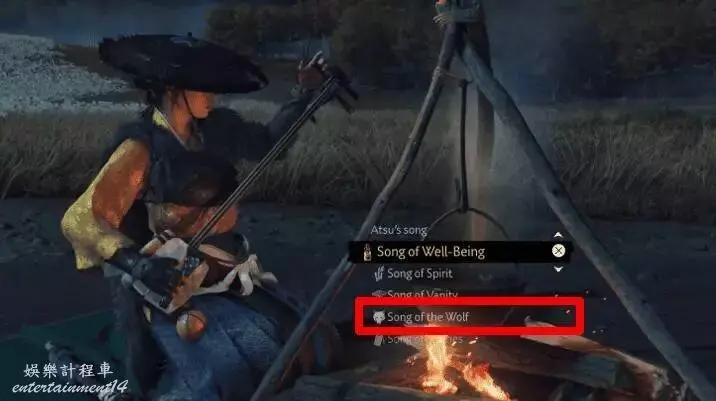 通過學習演奏《野狼之歌》,可召喚這位夥伴。用三味線彈奏此曲,就能召喚狼來到身邊,使其在一段時間內陪你一同戰鬥。(阿通可演奏的曲目還包括:《阿通的歌》《安康之歌》《精神之歌》《虛榮之歌》)