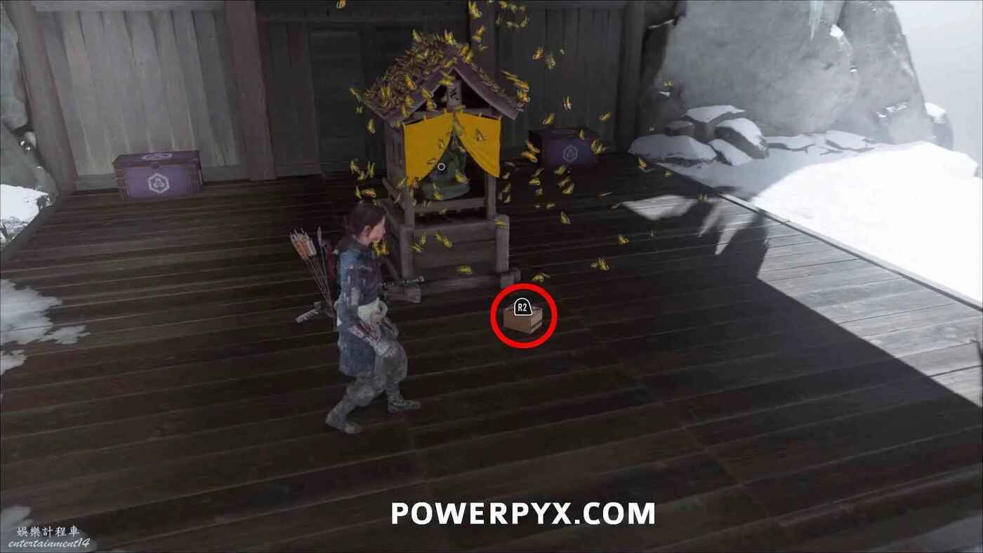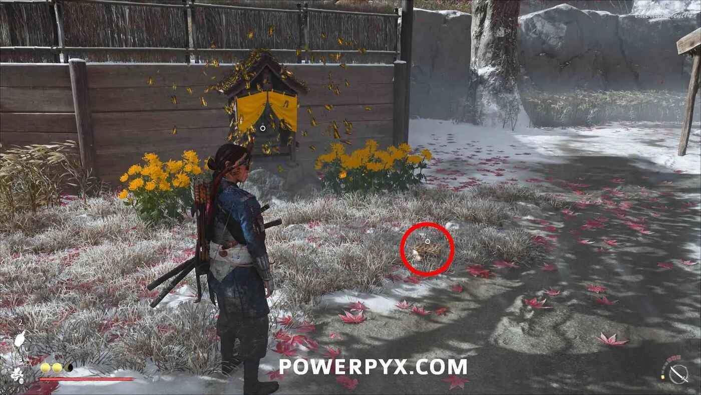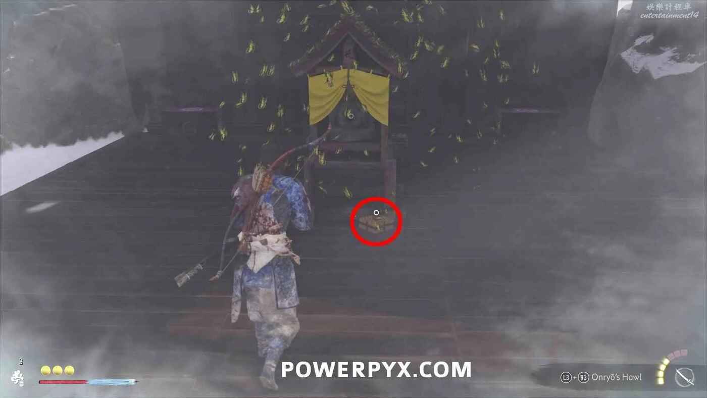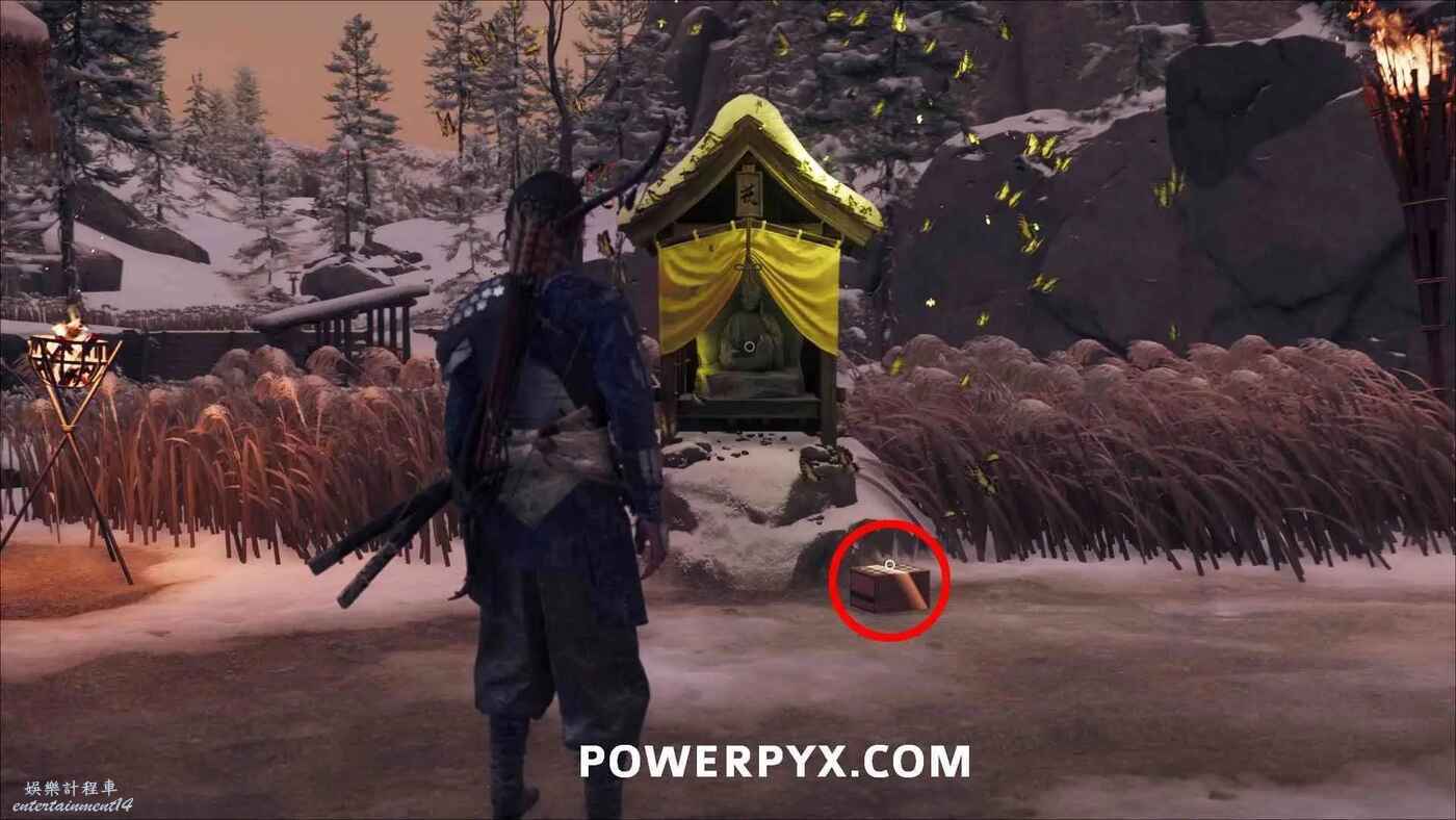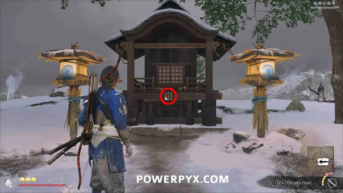 位於敵人營地的靜思祭壇前,此處為隱藏營地,需要通過紅葉森林的雪飄溫泉神社(地圖標記位置)進入。先解開狐狸雕像謎題(火把點燃正確的狐狸雕像,參考燈籠後方小島上的狐狸石像提示):首先從大門前的火盆取得火把。面向大門時,左右兩側各有3個狐狸雕像。左側需點燃最左邊的雕像(坐姿端正、口中銜棍的那只),右側需點燃最右邊的雕像(仰面朝天、口中銜棍的那只)。第三組雕像位於大門正對面,需要攀上岩壁才能到達,在那裡點燃中間那個坐姿雕像即可。