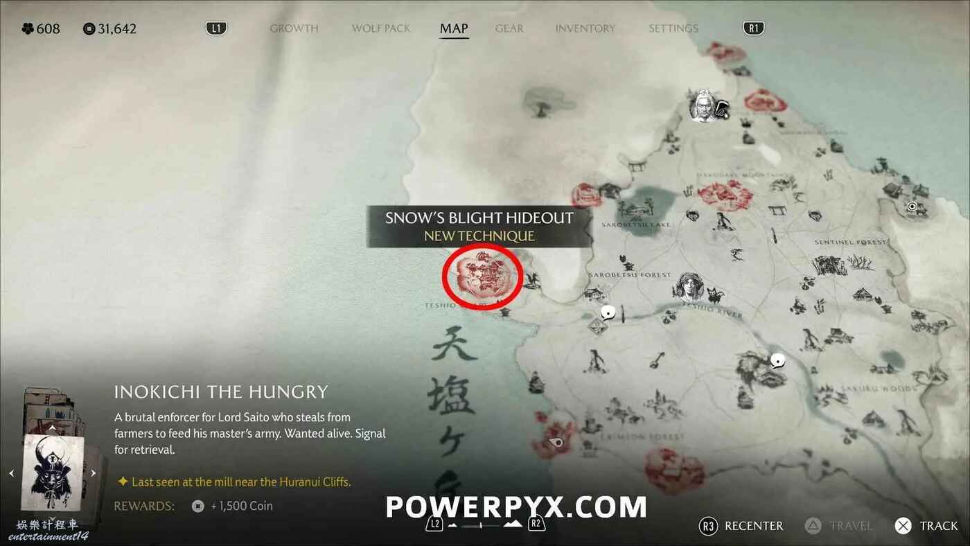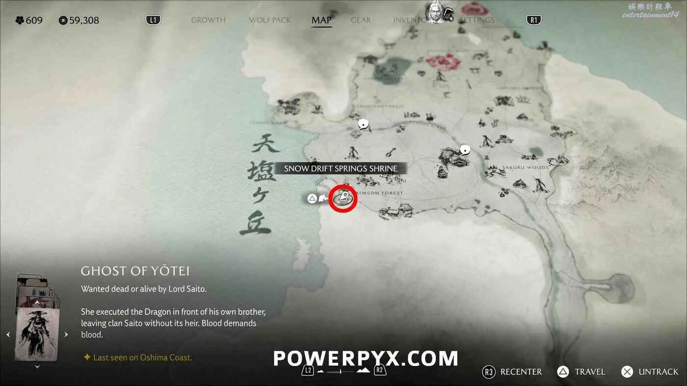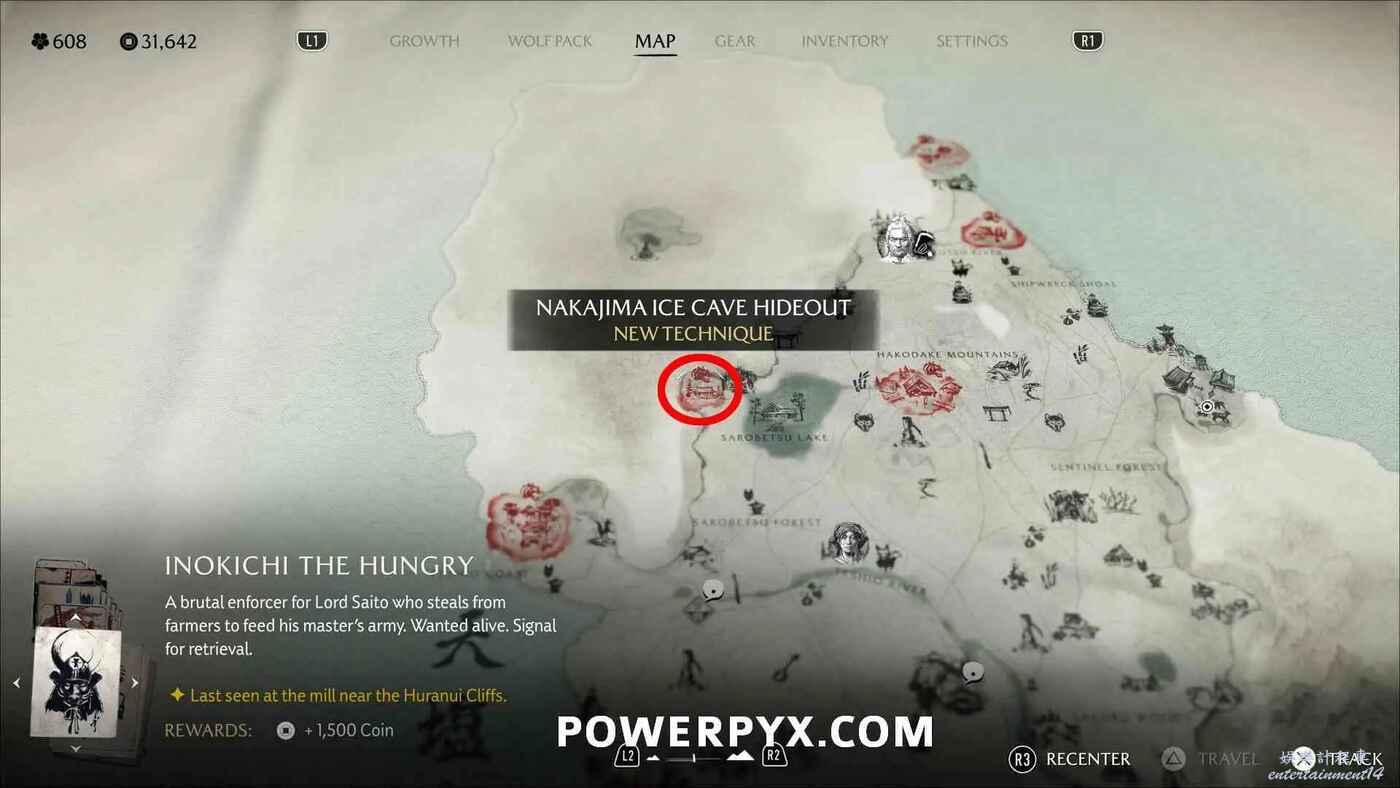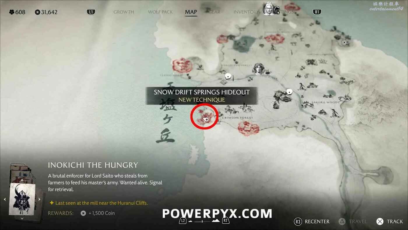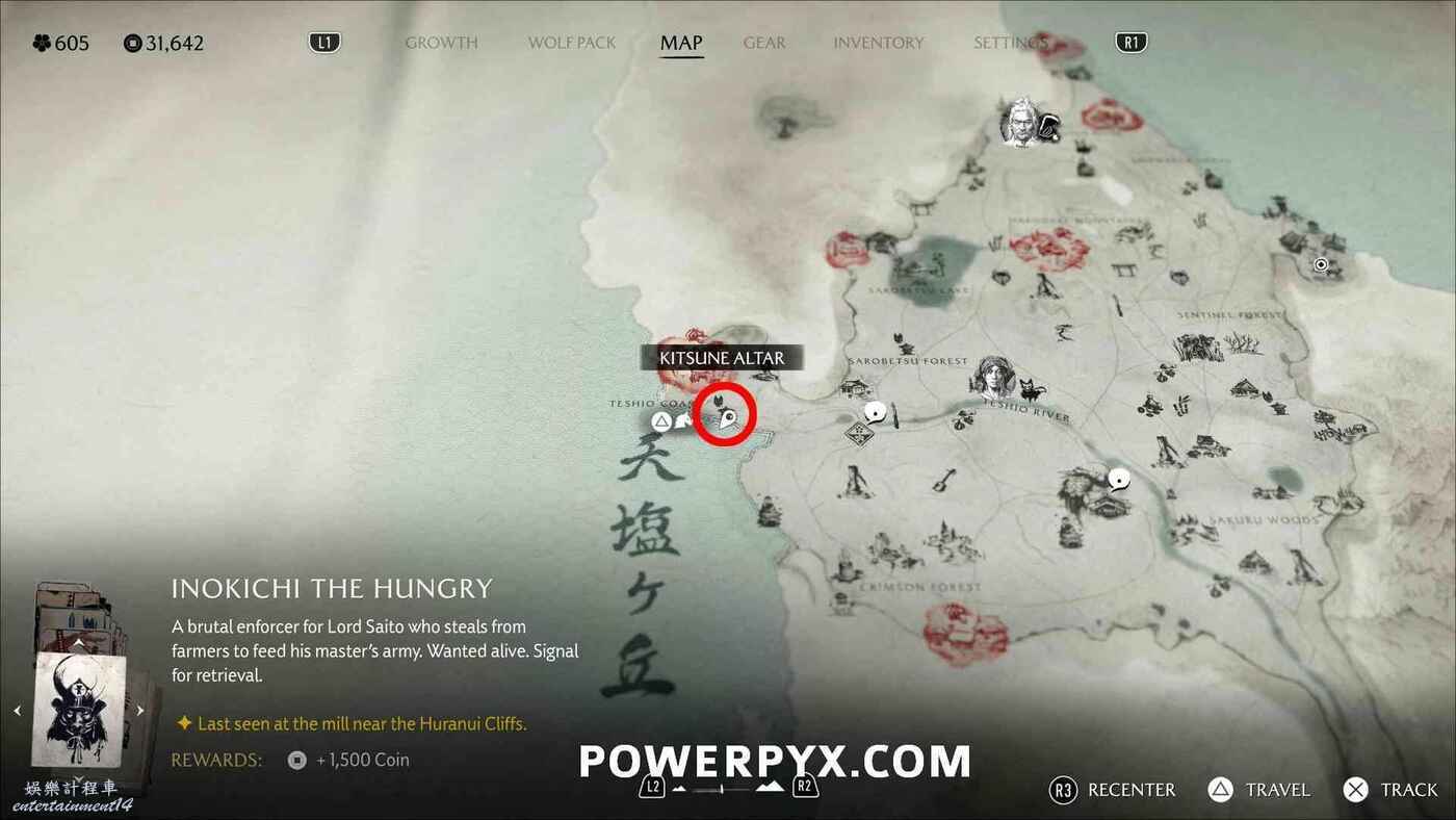 位於敵人營地的靜思祭壇前,此處為隱藏營地,需要通過紅葉森林的雪飄溫泉神社(地圖標記位置)進入。先解開狐狸雕像謎題(火把點燃正確的狐狸雕像,參考燈籠後方小島上的狐狸石像提示):首先從大門前的火盆取得火把。面向大門時,左右兩側各有3個狐狸雕像。左側需點燃最左邊的雕像(坐姿端正、口中銜棍的那只),右側需點燃最右邊的雕像(仰面朝天、口中銜棍的那只)。第三組雕像位於大門正對面,需要攀上岩壁才能到達,在那裡點燃中間那個坐姿雕像即可。
