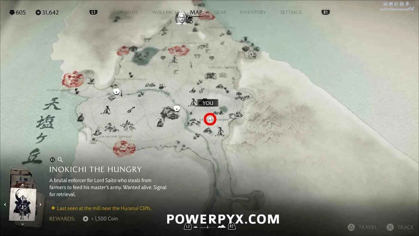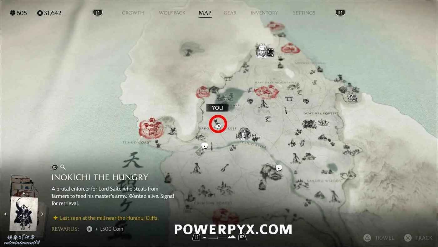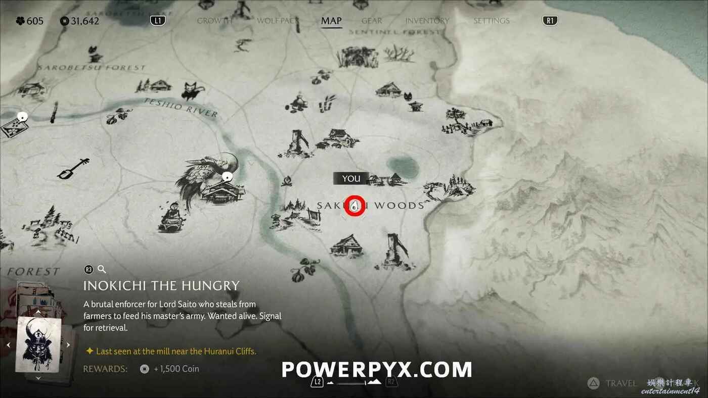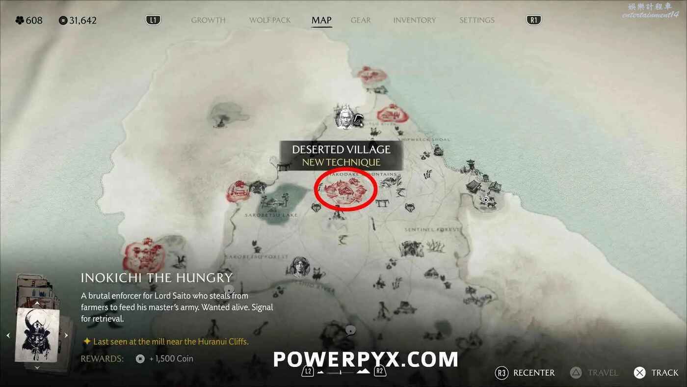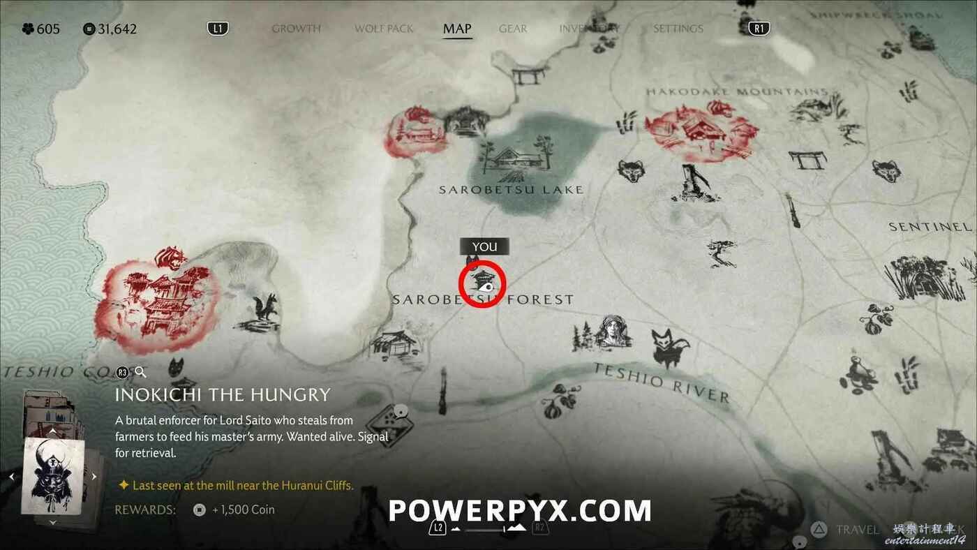 位於敵人營地的靜思祭壇前,此處為隱藏營地,需要通過紅葉森林的雪飄溫泉神社(地圖標記位置)進入。先解開狐狸雕像謎題(火把點燃正確的狐狸雕像,參考燈籠後方小島上的狐狸石像提示):首先從大門前的火盆取得火把。面向大門時,左右兩側各有3個狐狸雕像。左側需點燃最左邊的雕像(坐姿端正、口中銜棍的那只),右側需點燃最右邊的雕像(仰面朝天、口中銜棍的那只)。第三組雕像位於大門正對面,需要攀上岩壁才能到達,在那裡點燃中間那個坐姿雕像即可。