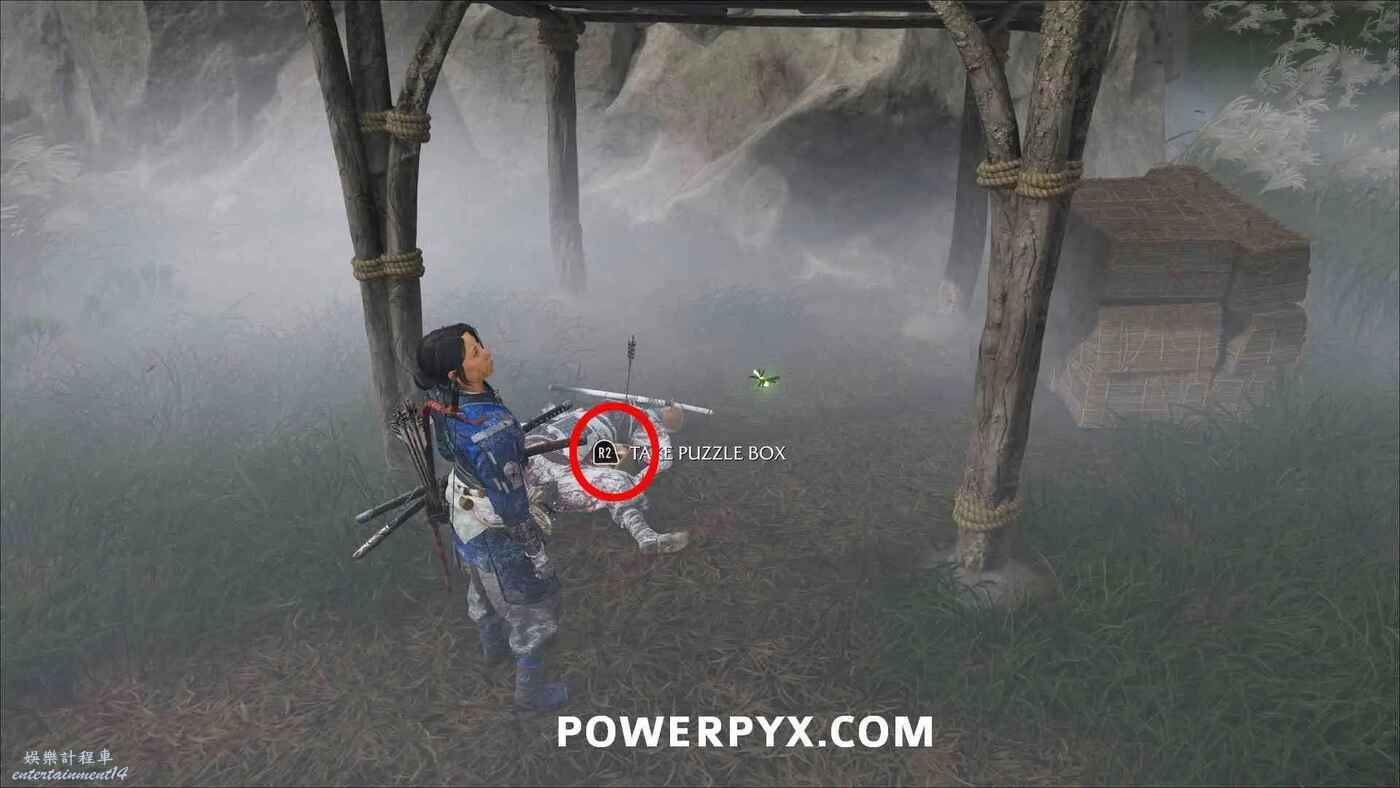 清掉所有敵人後,在營地右後方可以看見兩個狐狸雕像:將左側雕像旋轉一次使其面朝右,右側雕像旋轉三次使其面朝左(最終兩個雕像呈面對面狀態)。此時會出現通往營地盡頭祭壇的繩索,機關盒就在祭壇前的地面上。