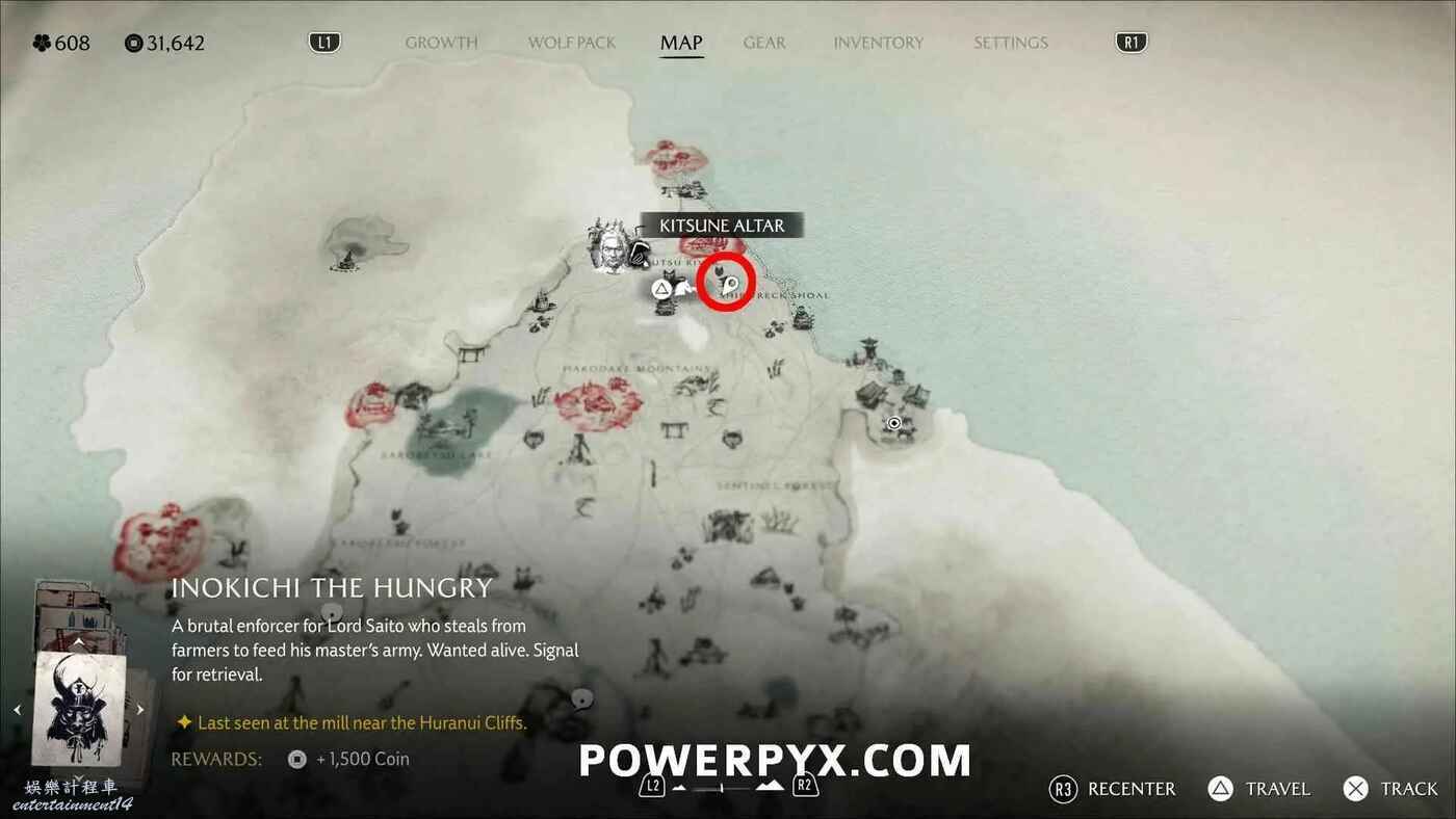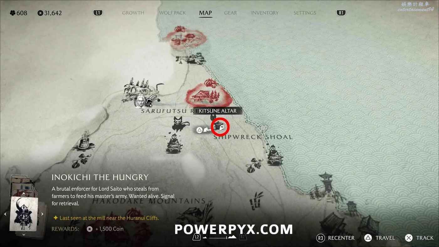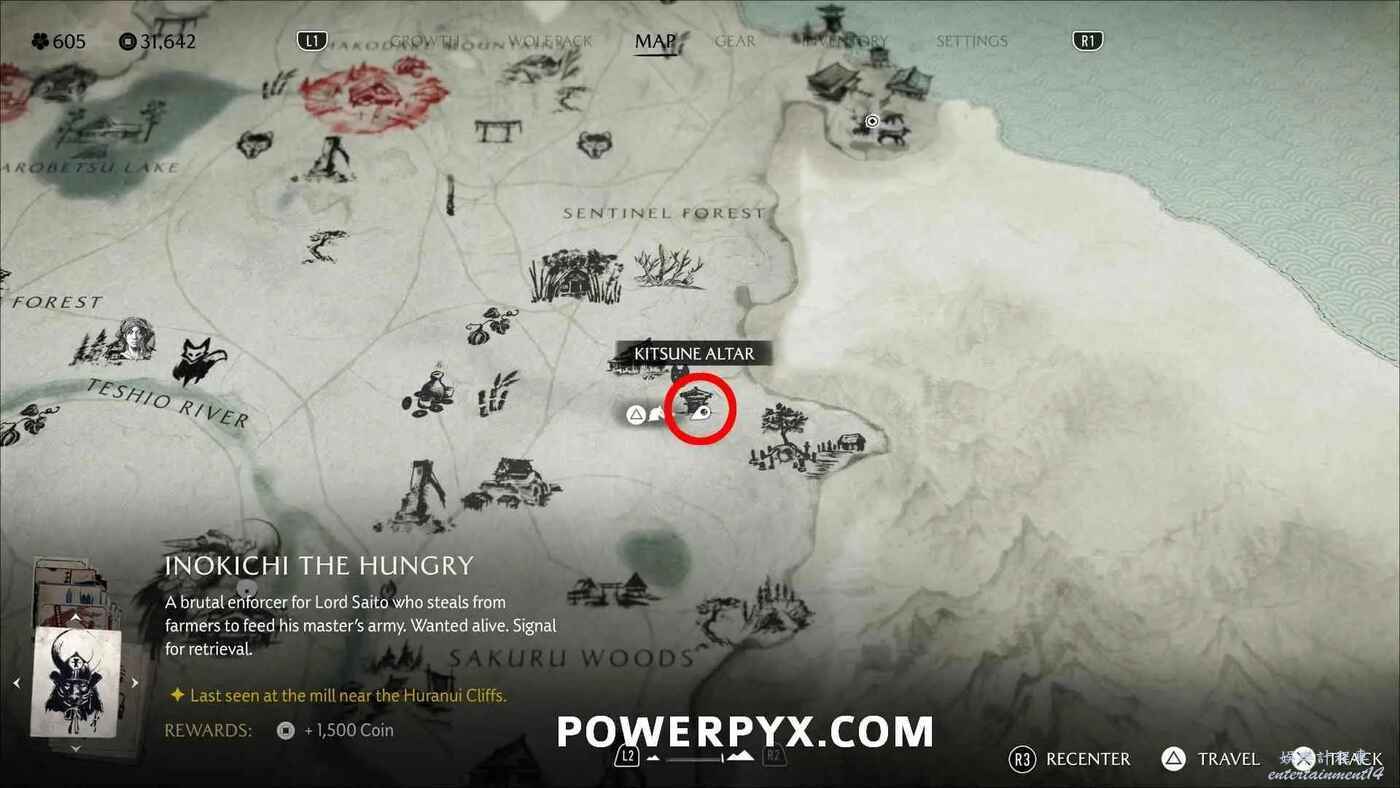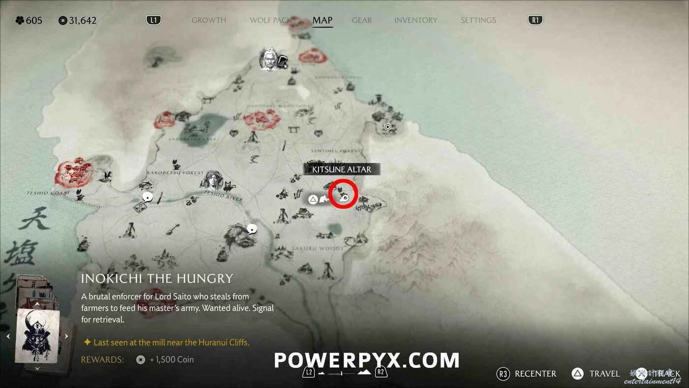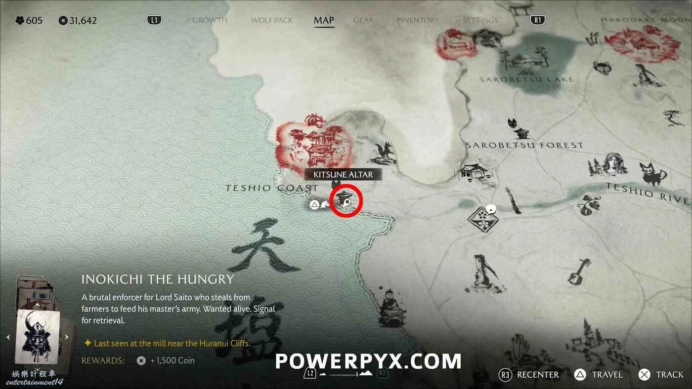 位於敵人營地的靜思祭壇前,此為隱藏的敵人營地,需要前往地圖最北邊的【稻荷岬神社】(地圖上標記位置)才能進入。抵達後可發現一道上鎖的大門,需要點亮兩盞帶有三叉戟圖示的狐狸燈籠。先穿過大門右側帶有藍色標記的岩縫,進入洞穴房間後右轉拿取火把,點燃洞內的狐狸雕像。返回室外,再穿過大門左側岩縫,點燃裡面帶三叉戟圖示的狐狸燈籠。