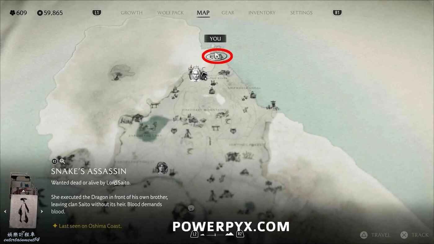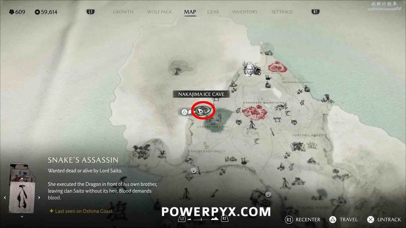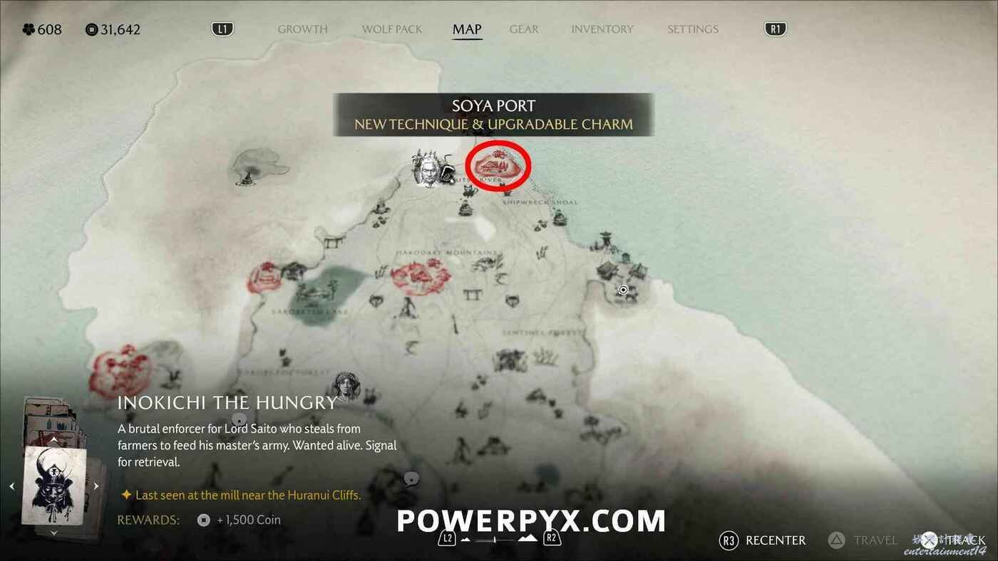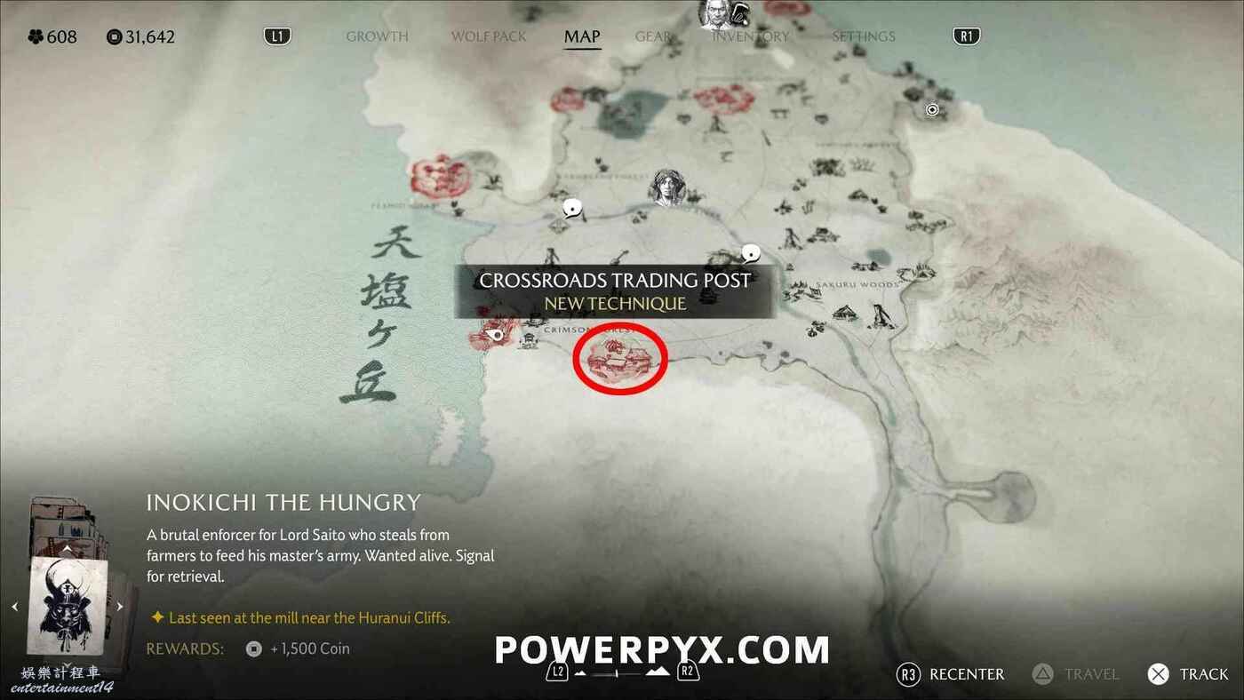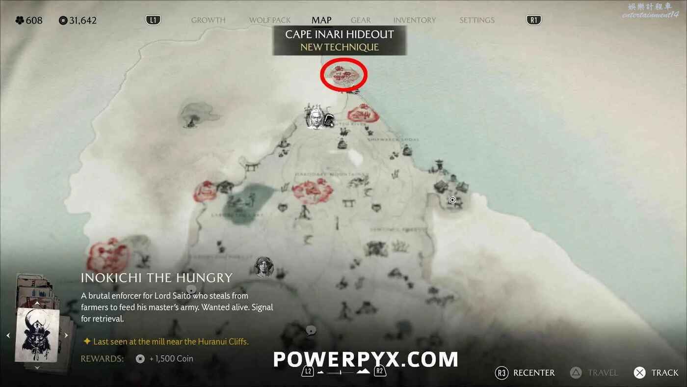 位於敵人營地的靜思祭壇前,此為隱藏的敵人營地,需要前往地圖最北邊的【稻荷岬神社】(地圖上標記位置)才能進入。抵達後可發現一道上鎖的大門,需要點亮兩盞帶有三叉戟圖示的狐狸燈籠。先穿過大門右側帶有藍色標記的岩縫,進入洞穴房間後右轉拿取火把,點燃洞內的狐狸雕像。返回室外,再穿過大門左側岩縫,點燃裡面帶三叉戟圖示的狐狸燈籠。