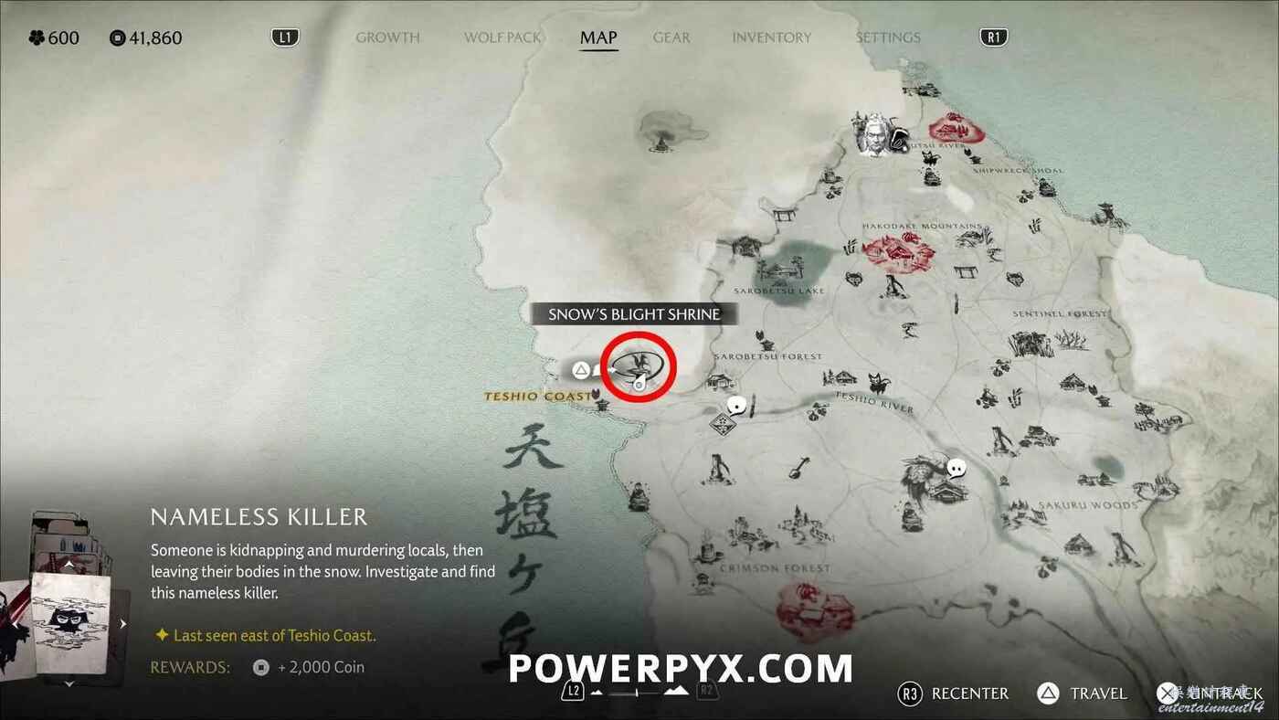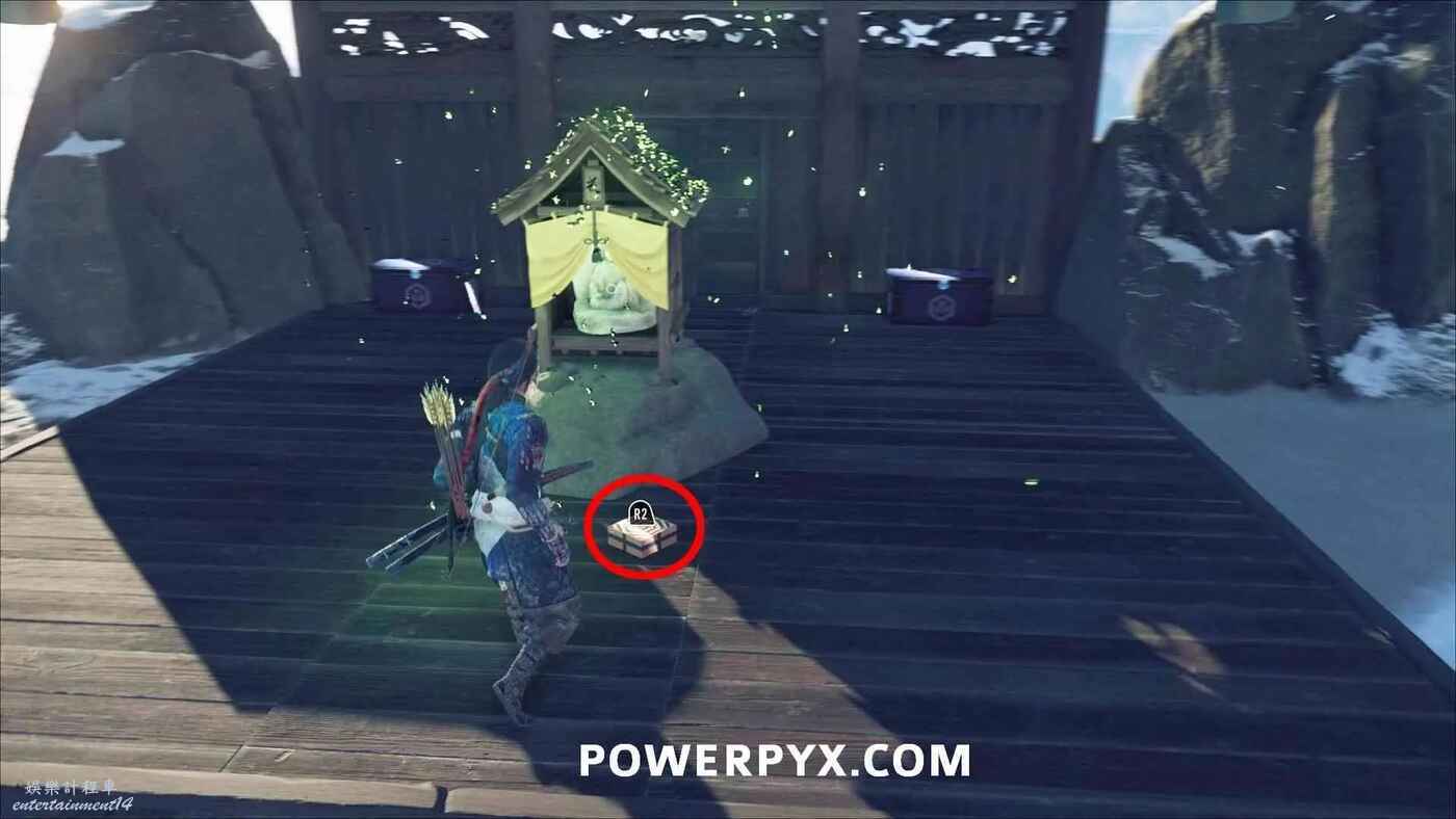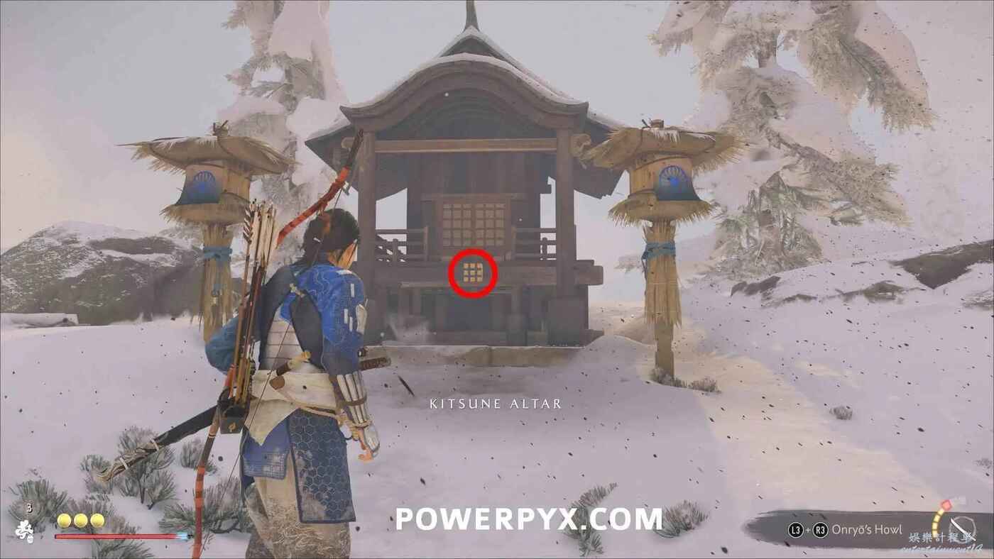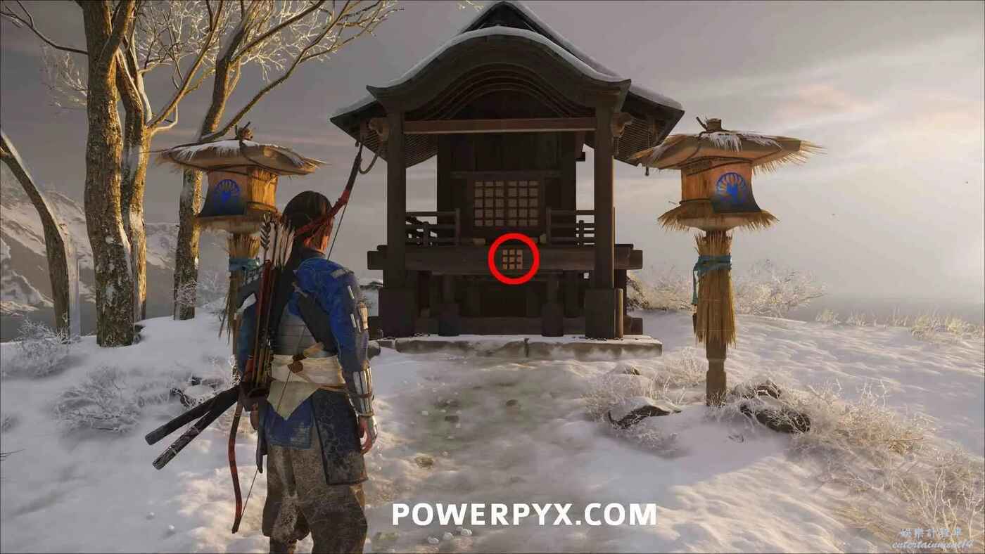 位於敵人營地的靜思祭壇前方,此處為隱藏營地,需要先齊納王天鹽山脊西北部的雪禍神社(地圖上有標記)。到達神社後先清掉周圍的敵人,然後解救俘虜,接下來需要解開神社謎題才能開啟通往隱藏營地的道路:在左側區域拿起火把,點燃上方懸掛著點亮燈籠的兩個燭台。在右側區域調整狐狸雕像的方向,使其與牆上雕刻的石狐朝向完全一致。