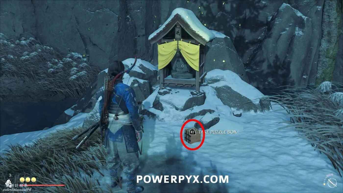 此時能聽到機關聲,門的下方會出現通道。穿過通道來到有更多狐狸燈籠區域,再次用火把點燃兩盞帶三叉戟圖示的燈籠(一盞在懸崖邊,一盞在建築內,注意帶感嘆號圖示的燈籠會傷血)。隨後出現繩索,利用繩索跳到木制平台,爬岩壁到頂端(注意攀爬點被積雪覆蓋著比較難辨認)即可抵達敵人營地。清完敵人後,在右側斷橋處可以看到火盆與狐狸燈籠,點燃出現新繩索,使用繩索到達另一座山,清除敵人後繼續取火把點燃懸崖邊的狐狸燈籠,最後出現的繩索通向祭壇,機關盒就在祭壇前方的地面上。