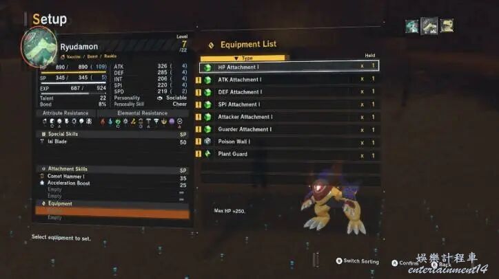 請注意,裝備的屬性提升不會在數碼寶貝進行數碼進化或去數碼進化時延續到其累積屬性中。