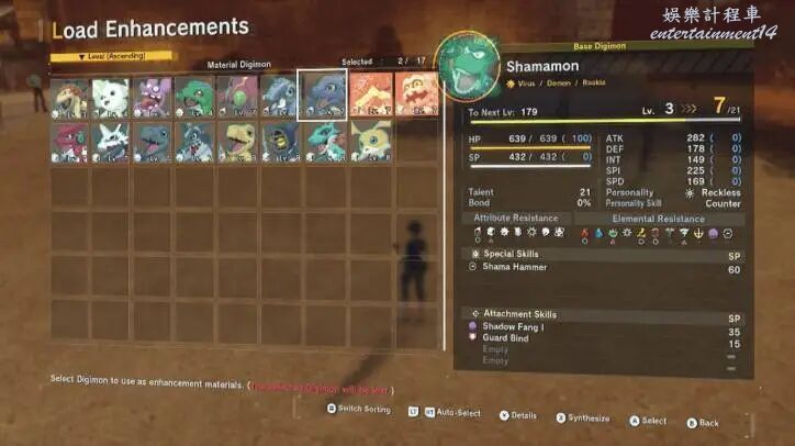 您可以使用載入增強功能來快速升級和提高所選數碼寶貝的屬性。這個過程是通過在你的儲備中餵食較弱的材料數碼寶貝來增強你選擇的數碼寶貝來完成的。