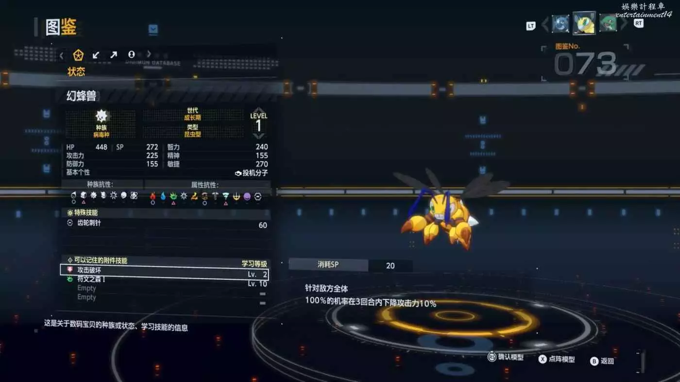 最後是攻擊破壞唯一的來源幻蜂獸,這一代單體debuff是以“束縛”冠名,如“防禦束縛”,而群體debuff則以“破壞”冠名,試玩版可繼承部分唯一能拿到的群體debuff和攻擊debuff就是幻蜂獸的“攻擊破壞”;和buff一樣,群體debuff對所有敵人生效,代價則是效果量僅為10%;單體debuff效果量略低於buff,為20%;debuff效果上限和buff一樣都是60%。