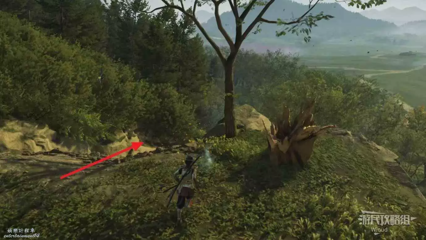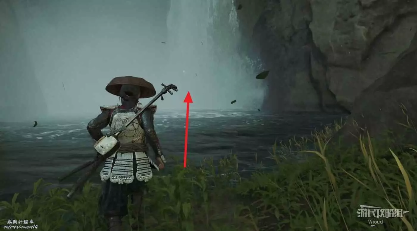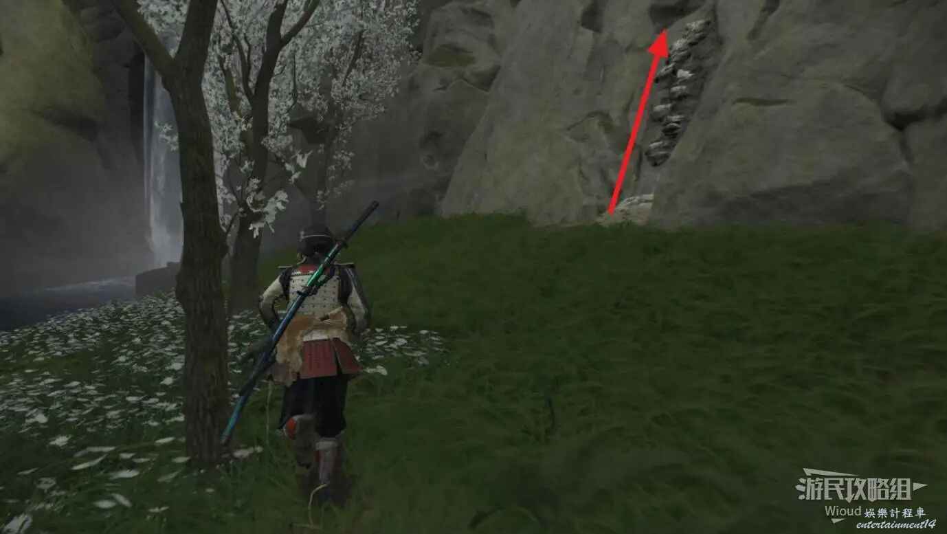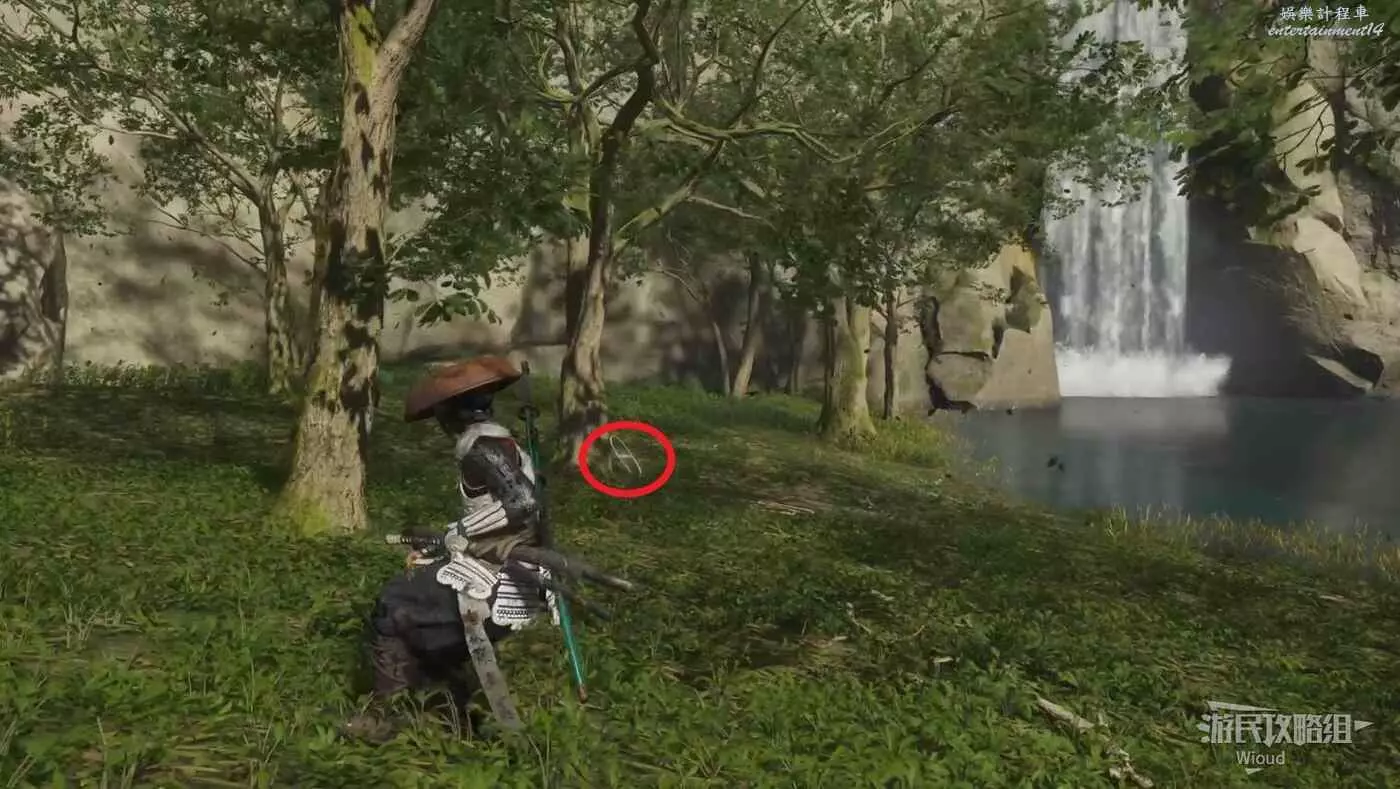 移動到目的地,面對瀑布可在左側的一棵樹前找到這個物品。