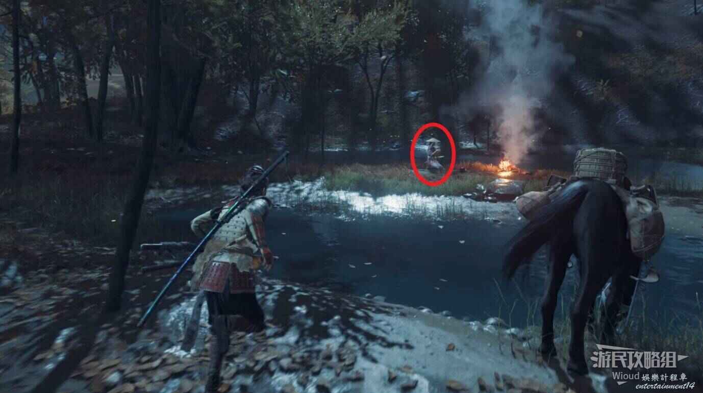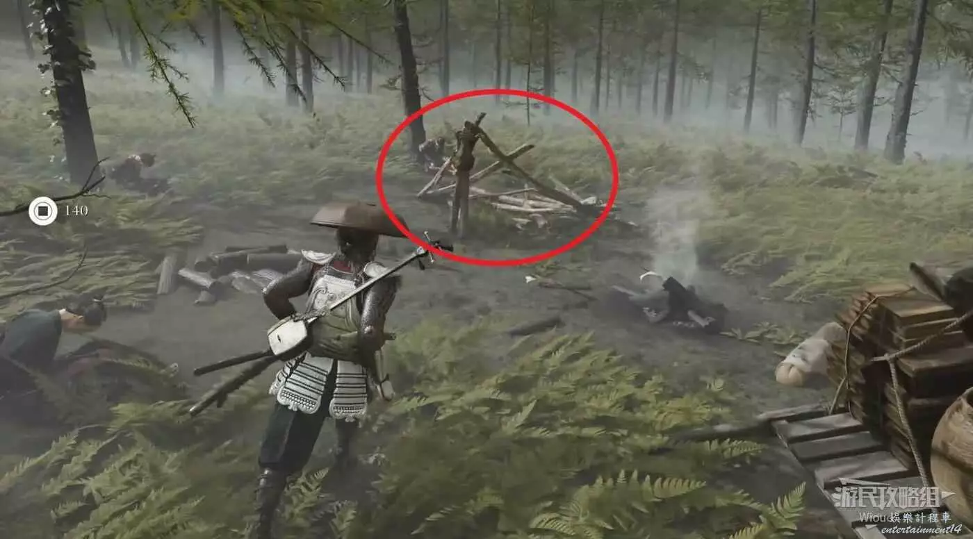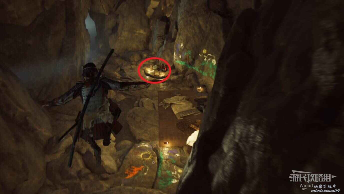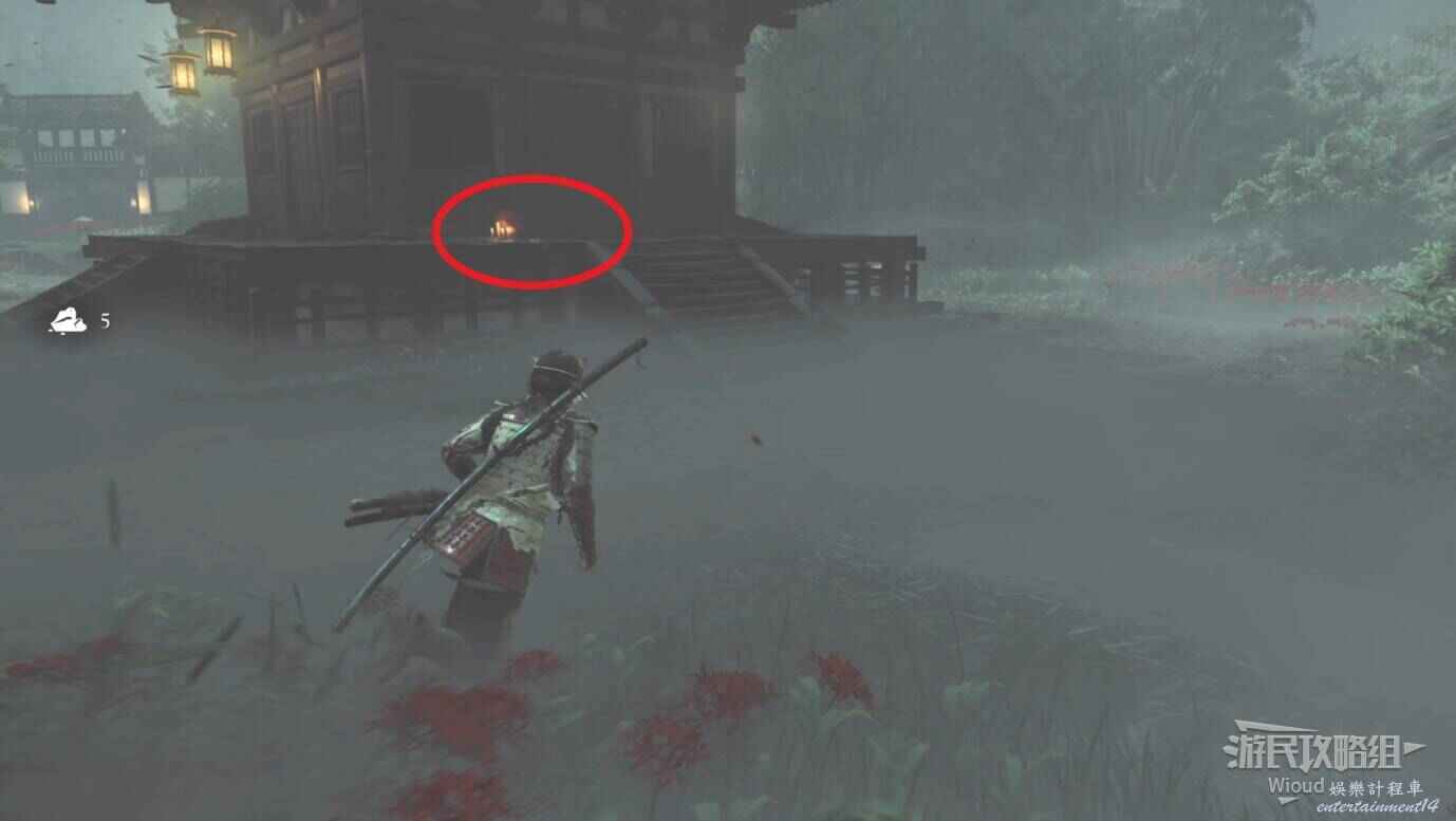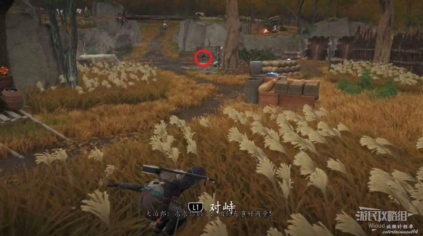 將敵人全幹掉,過完劇情點燃旁邊篝火,然後爬到後面和大治郎互動。