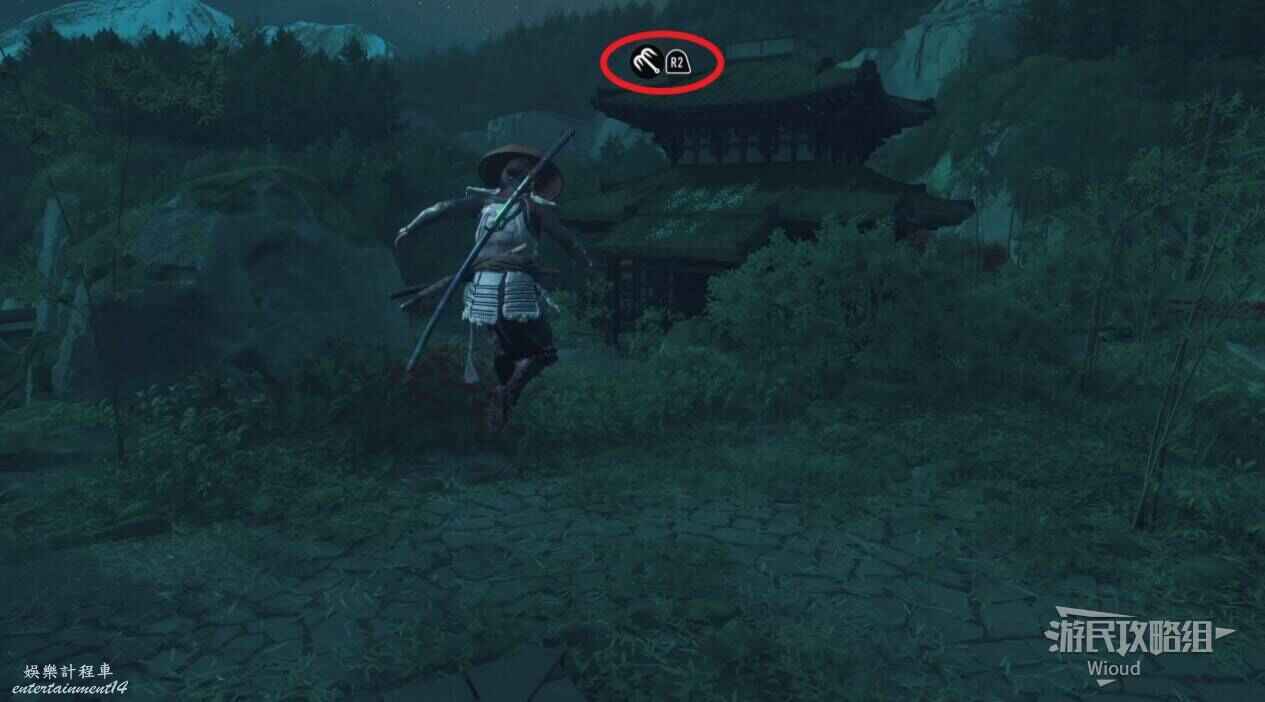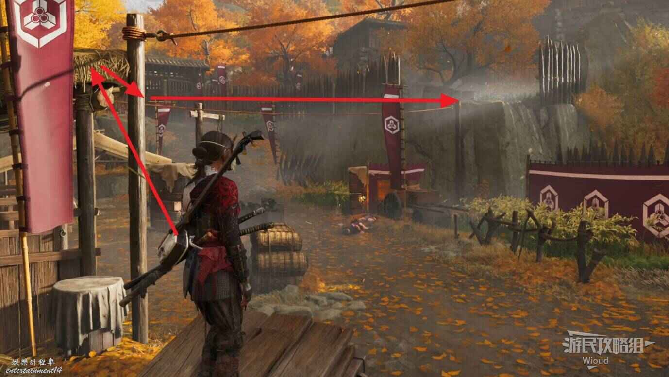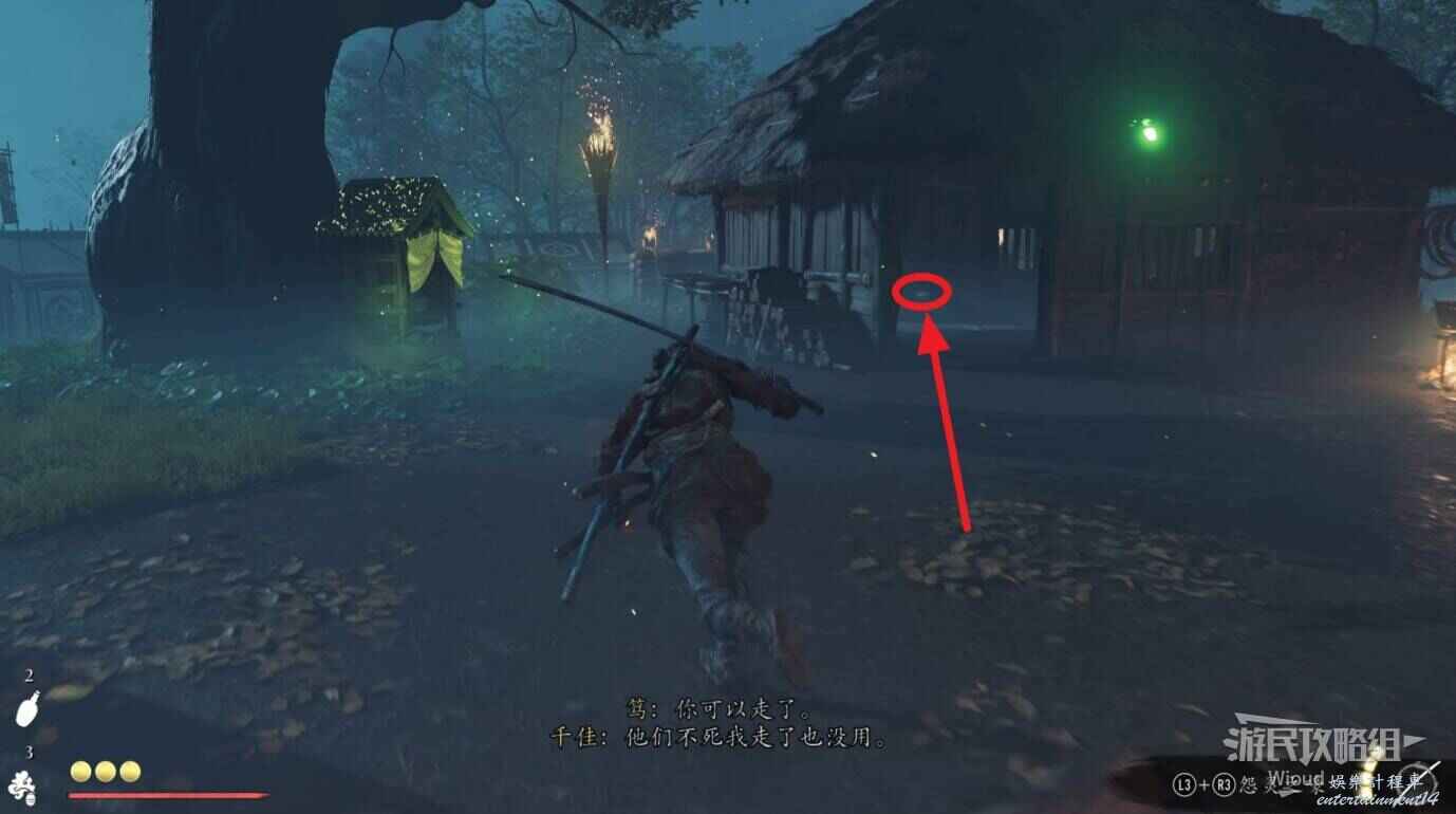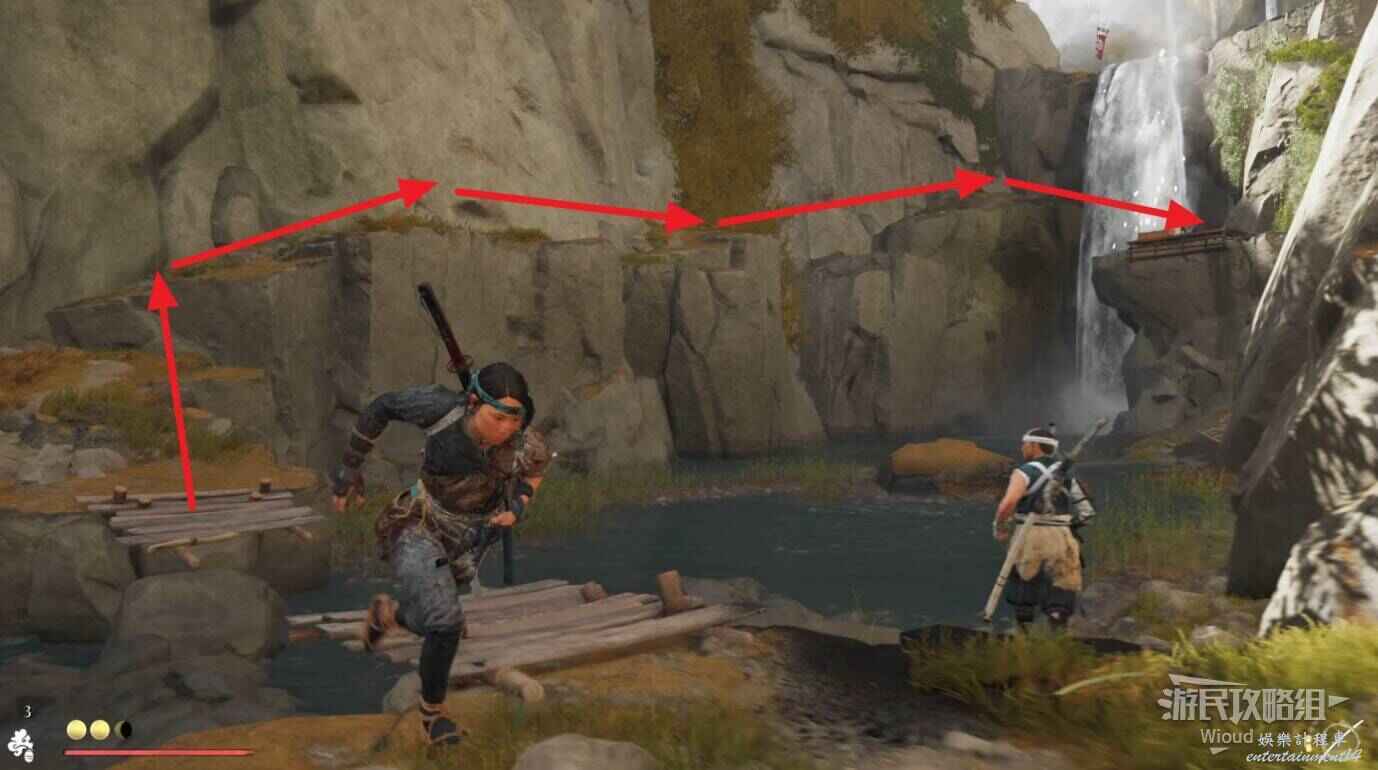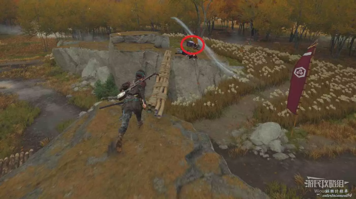 將敵人全幹掉,過完劇情點燃旁邊篝火,然後爬到後面和大治郎互動。