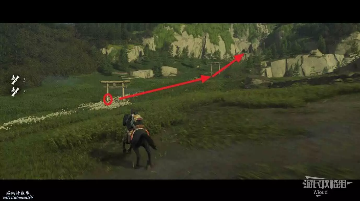 後續需要下馬沿著路線跑酷到山頂,鳴澤神社的跑酷路線比較簡單。