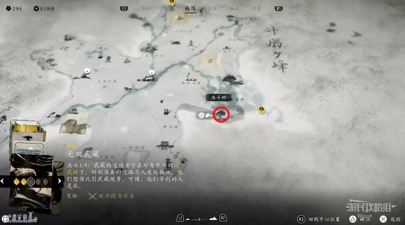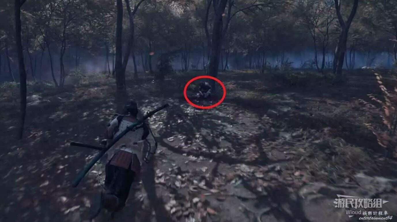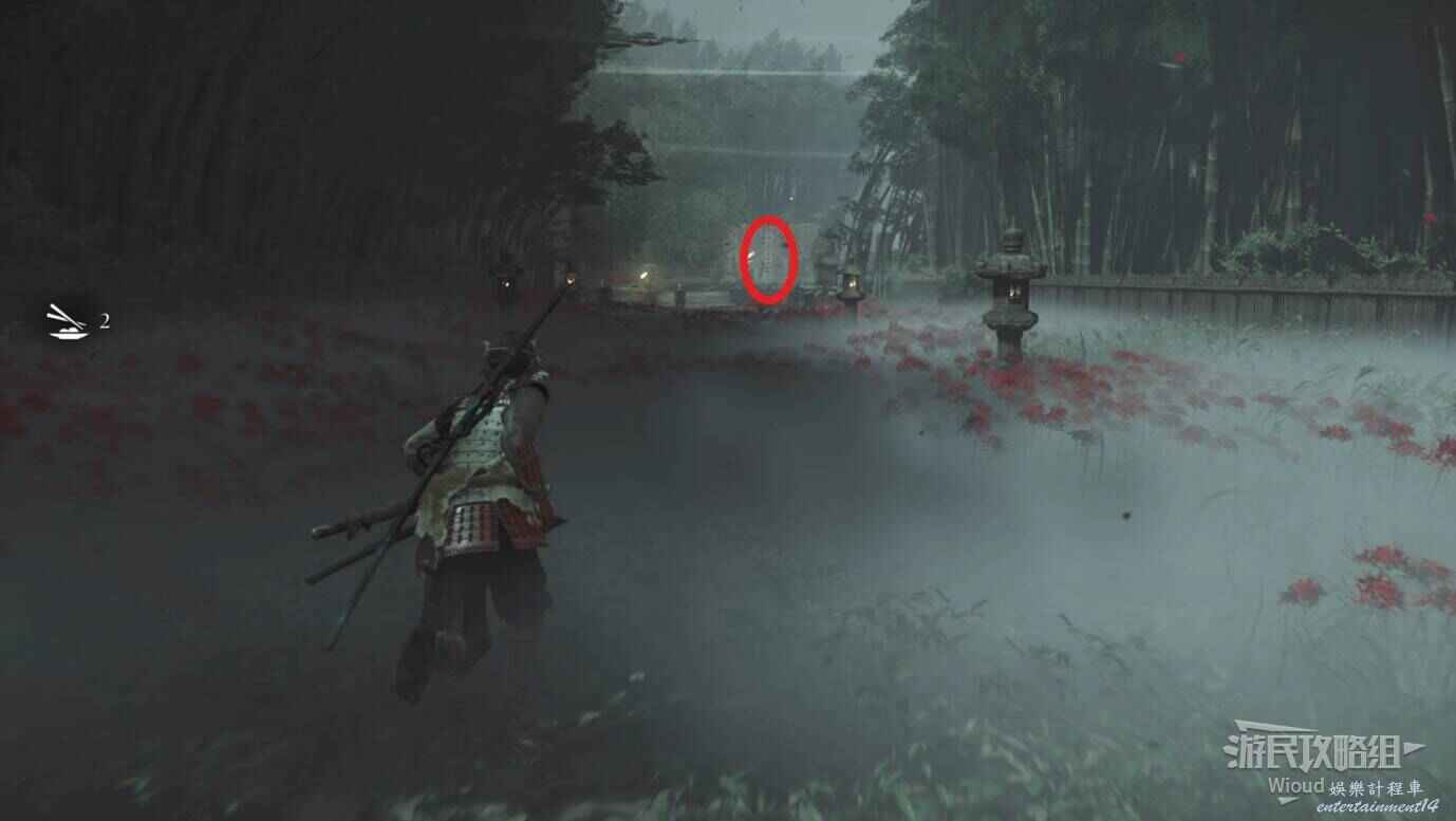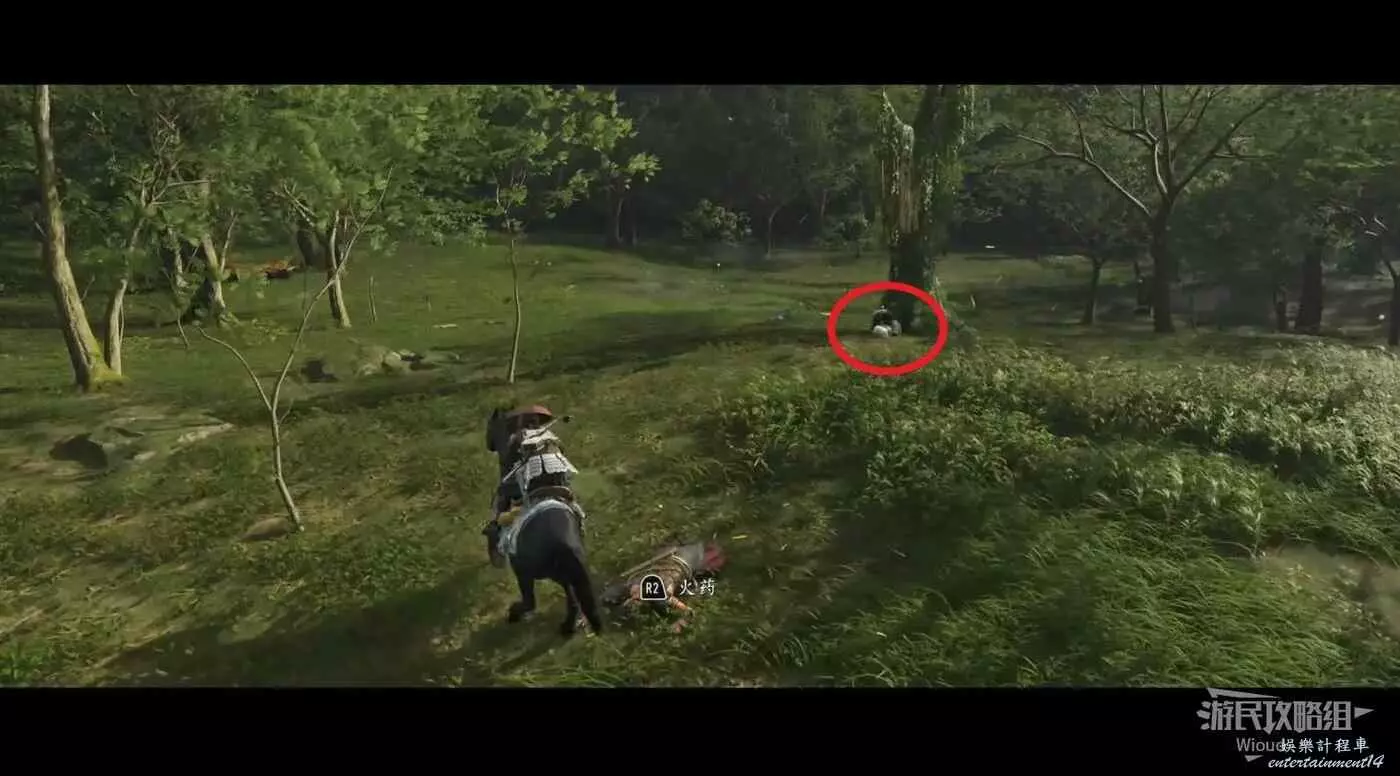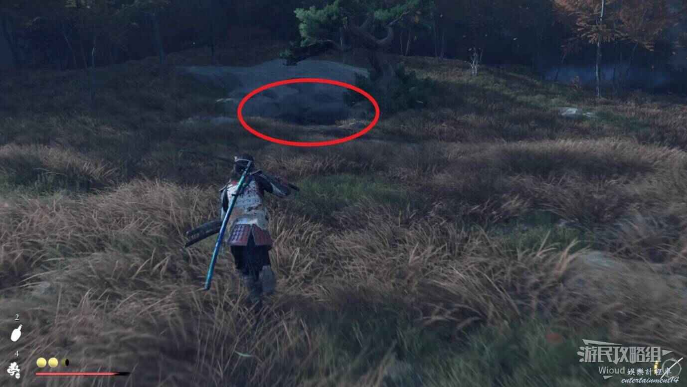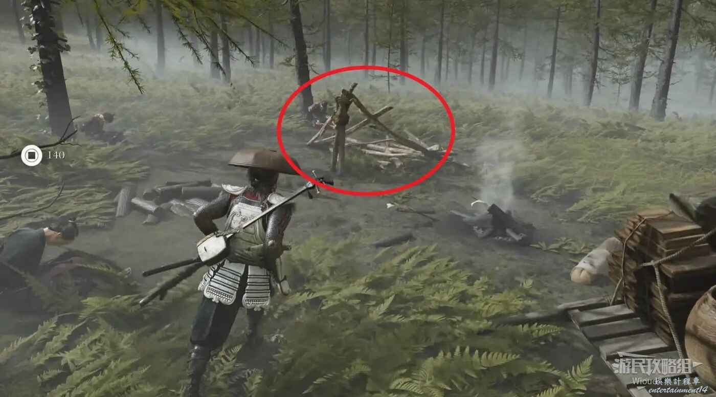 敵人就在樹下等著,靠近觸發戰鬥,將其擊敗獲得【武藏之頑抗護身符】。