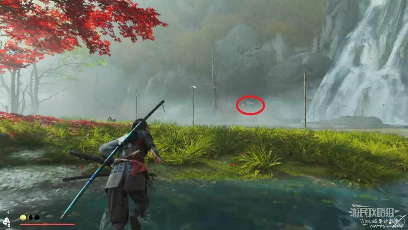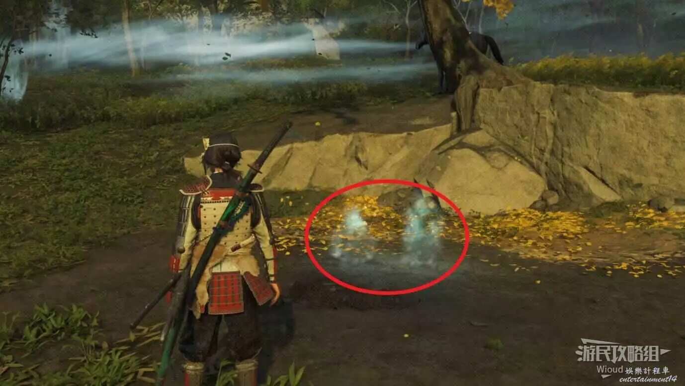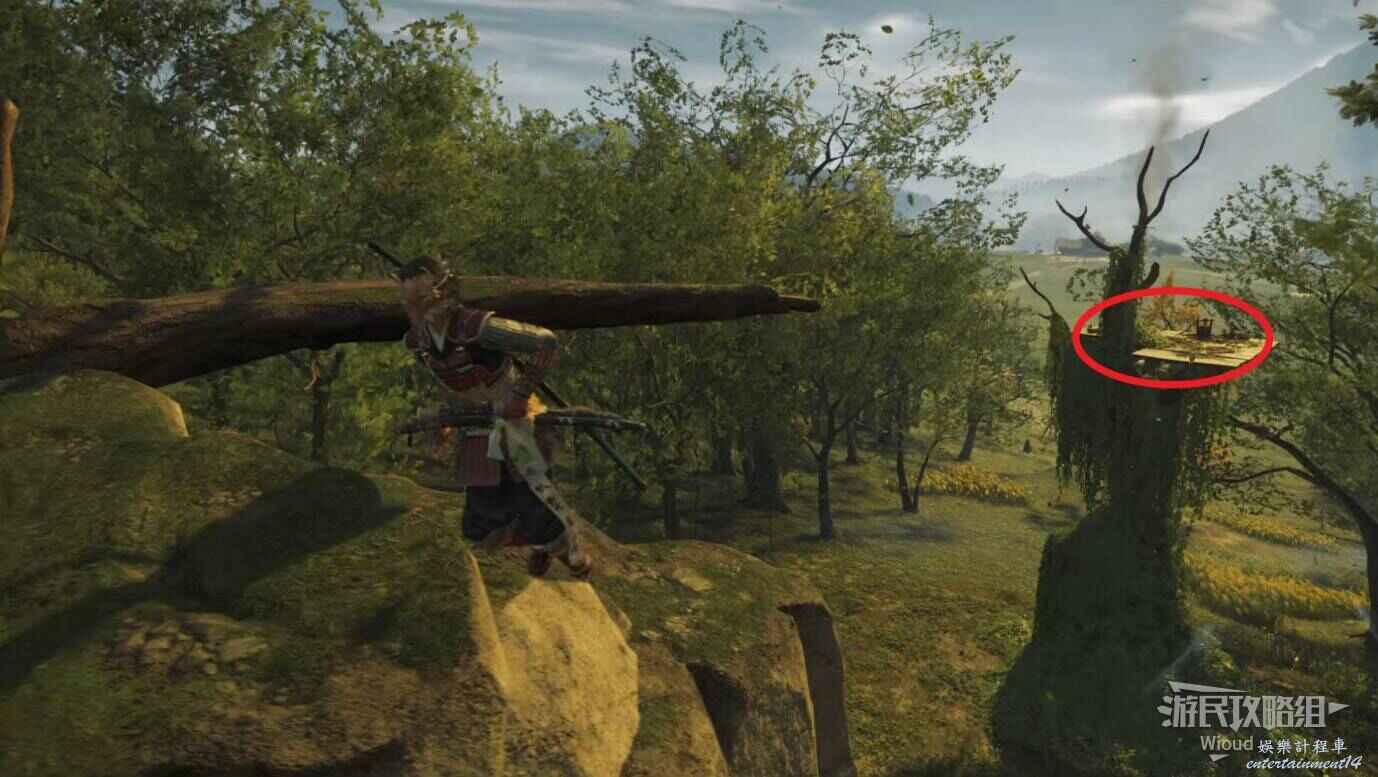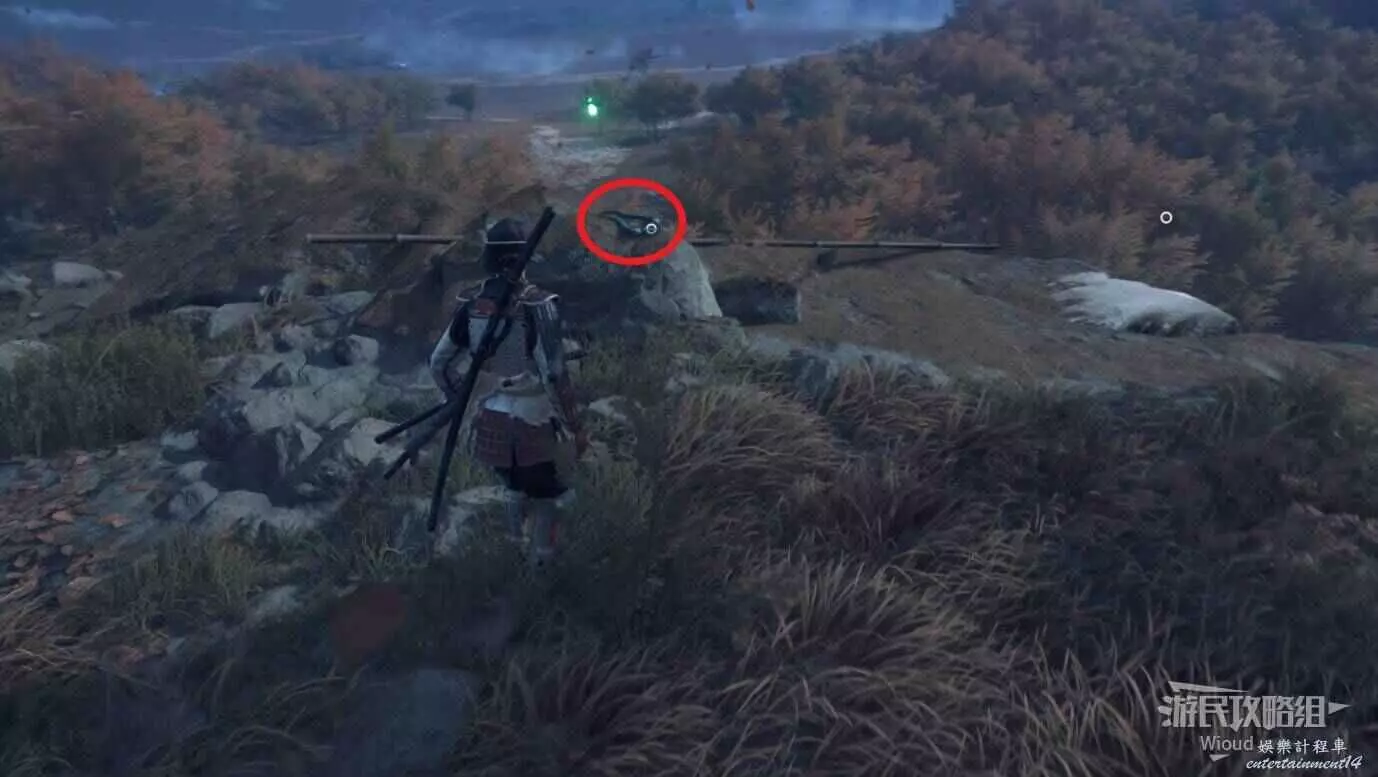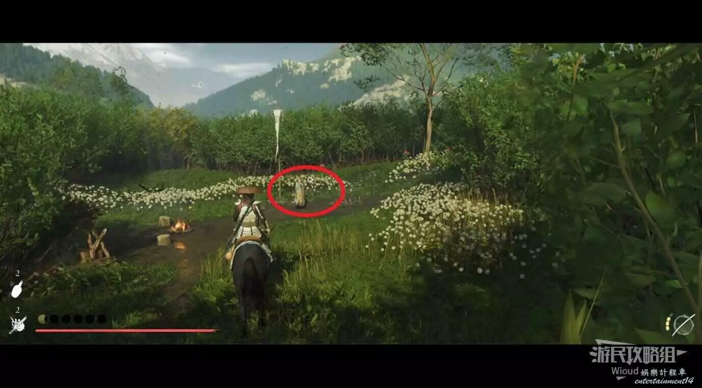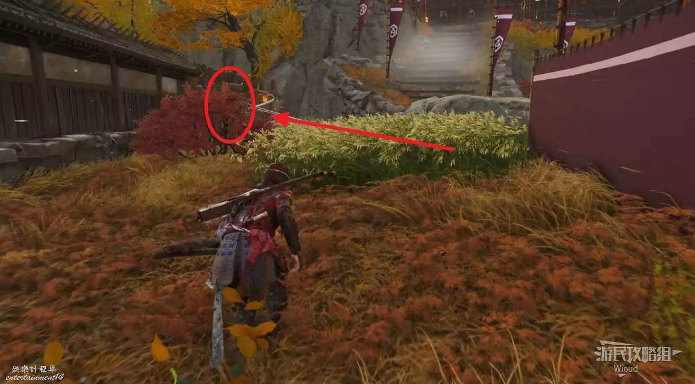 敵人就在樹下等著,靠近觸發戰鬥,將其擊敗獲得【武藏之頑抗護身符】。