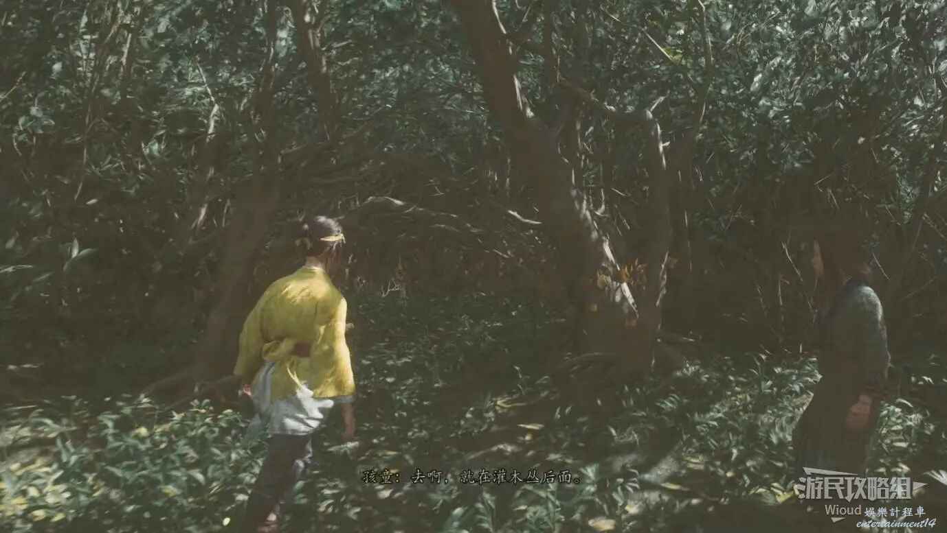 來到目的地看到兩個身影,進入回憶跟著小女孩走到灌木叢前鑽過去走到頂。