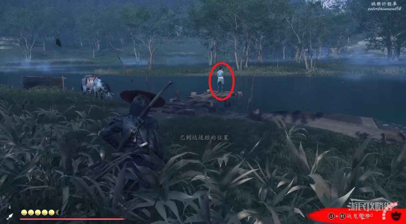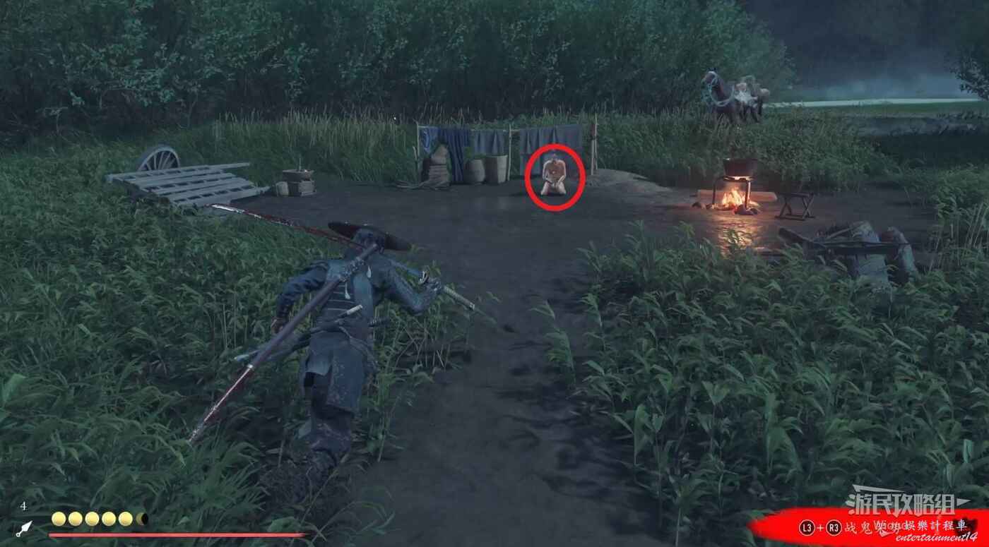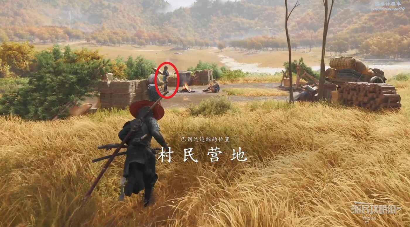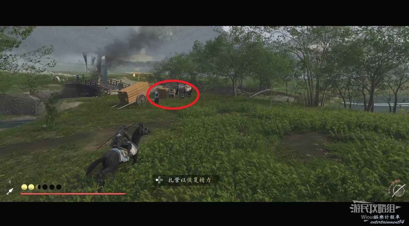 來到目的地和橋樑前的武士對話接取任務,然後跟著商人走到一個營地過劇情。