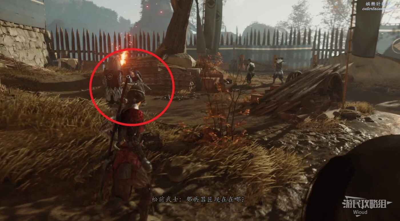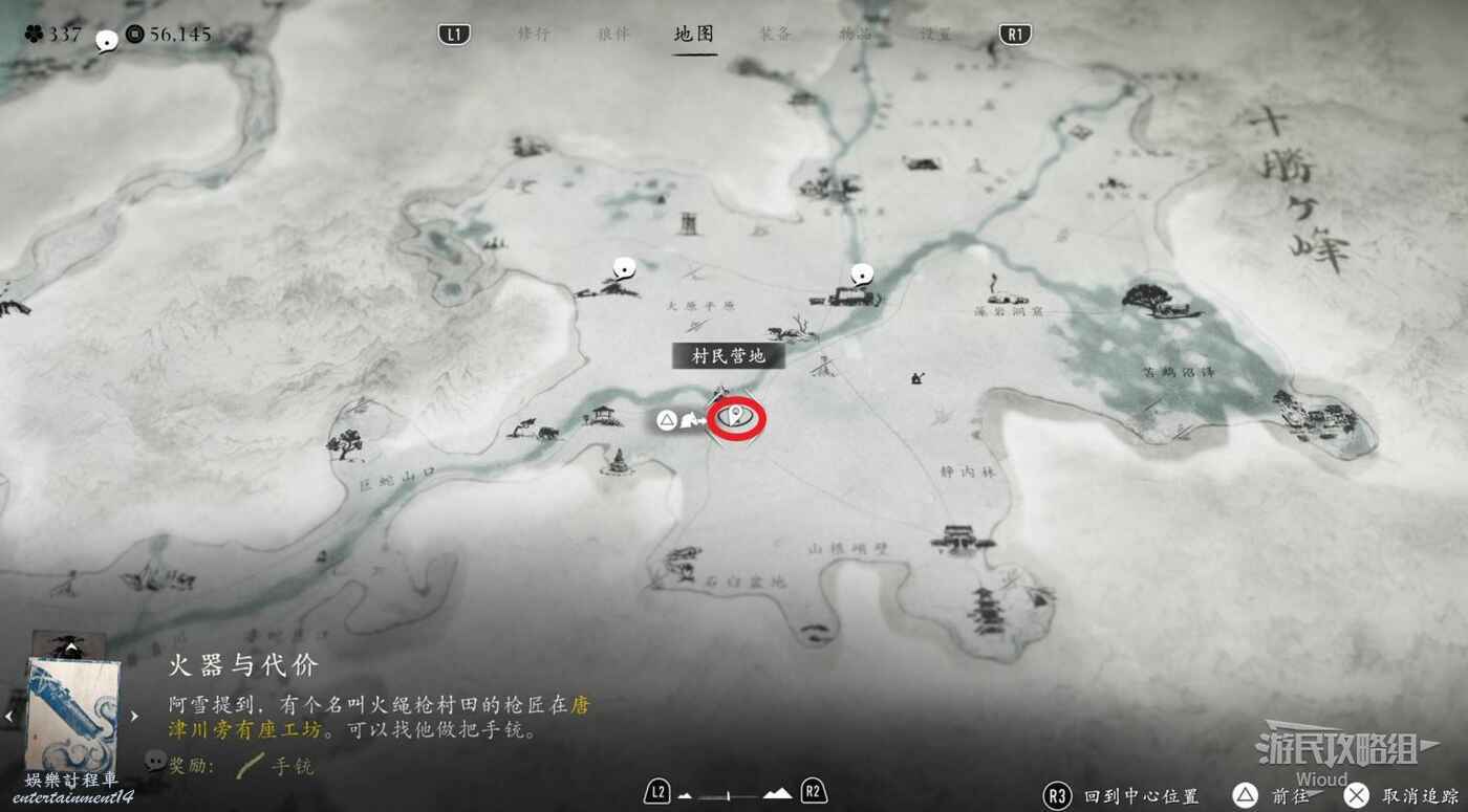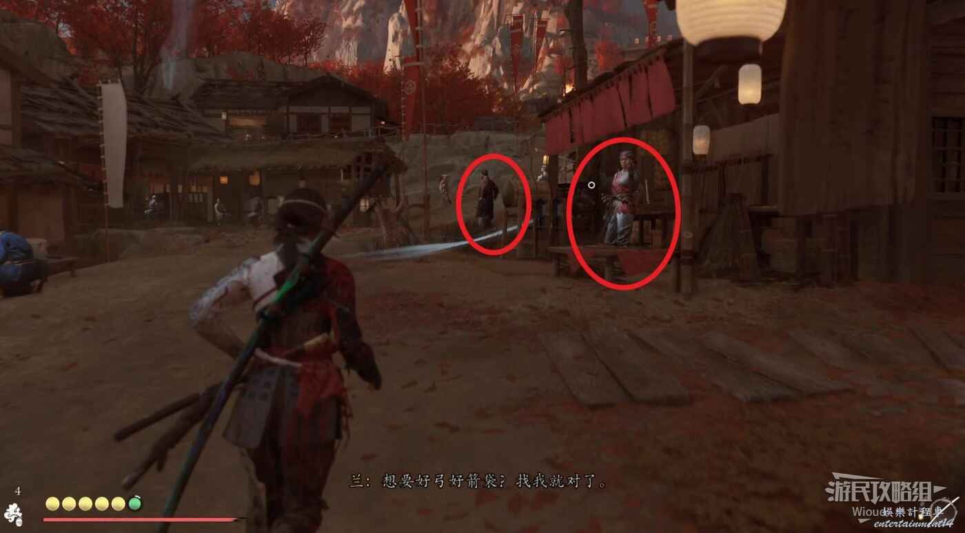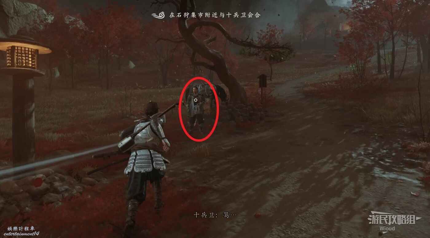 來到目的地和橋樑前的武士對話接取任務,然後跟著商人走到一個營地過劇情。