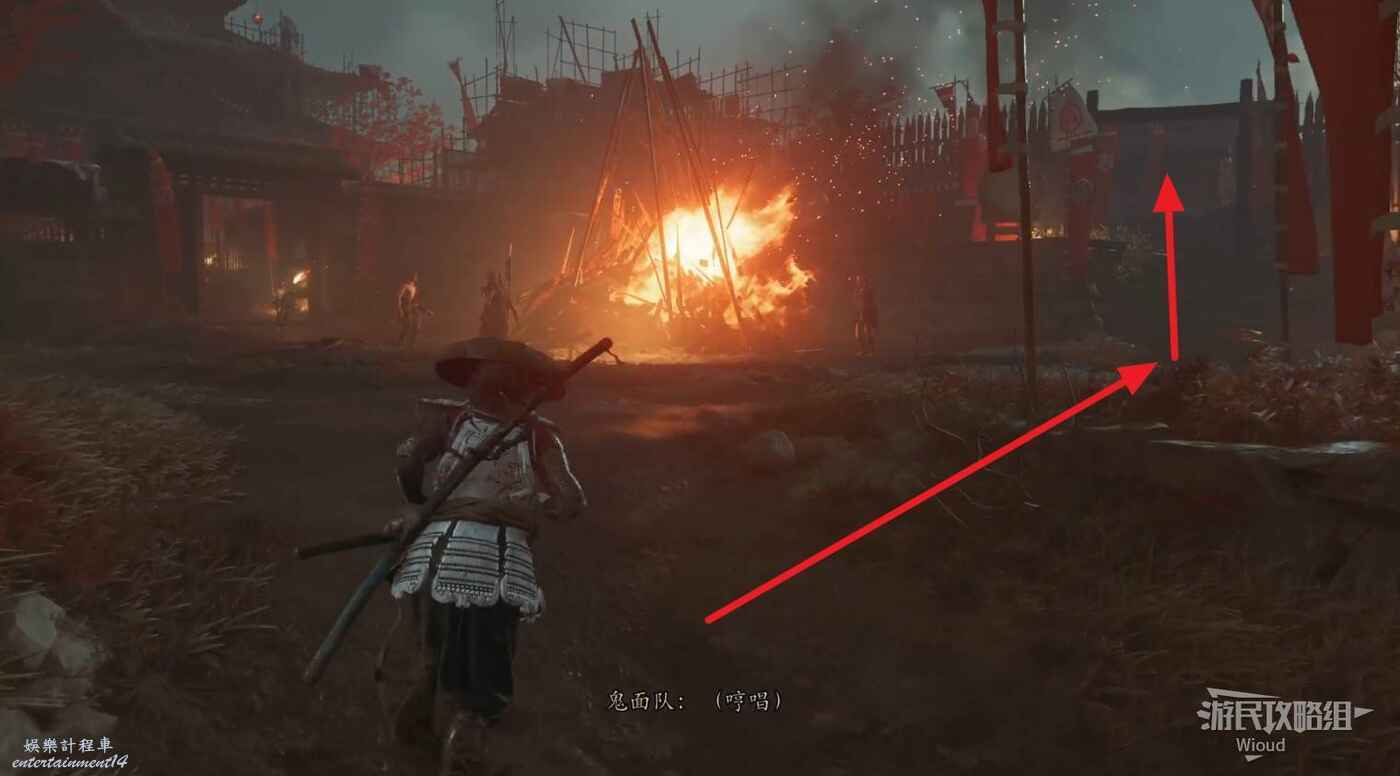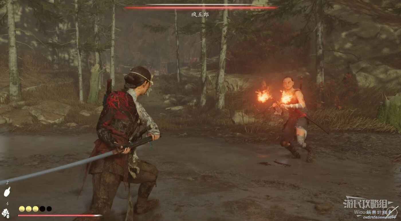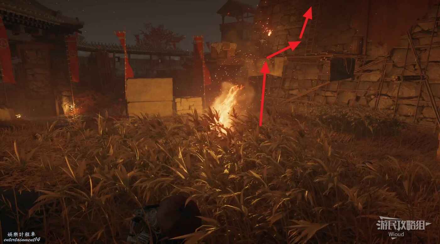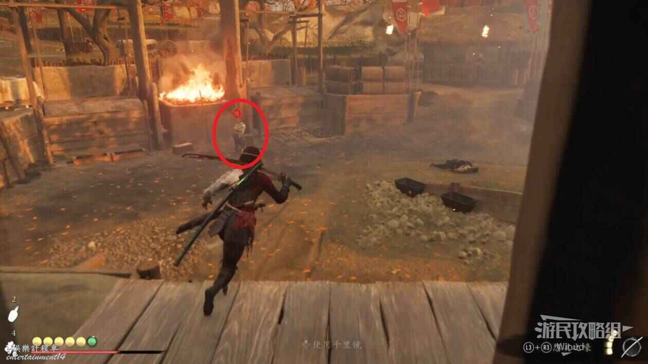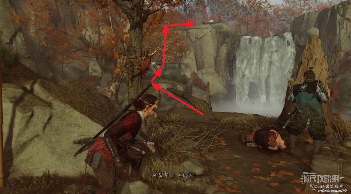 敵人逃進一片燒焦的森林後,下馬走路進去,爬左邊山壁上的攀附節點上去幹掉瘋五郎。