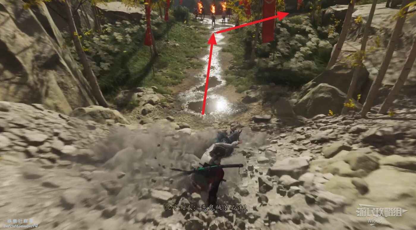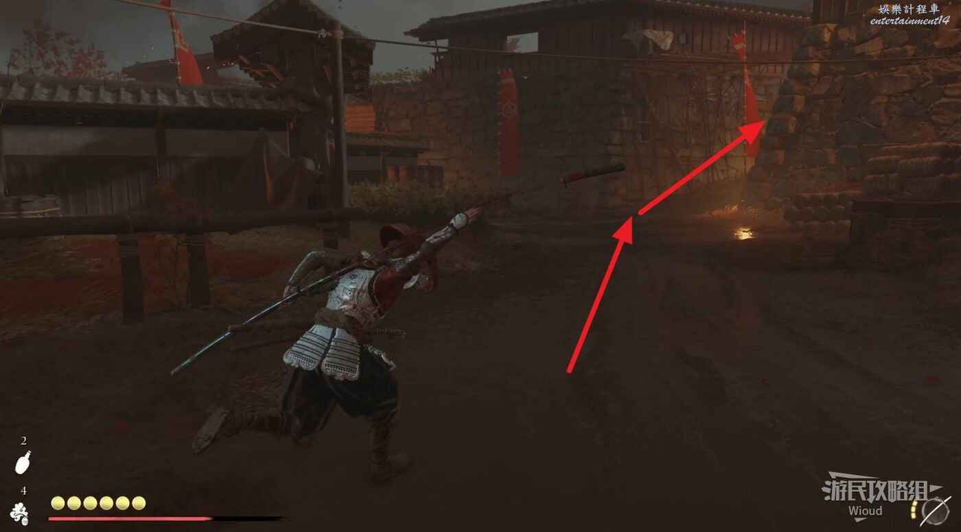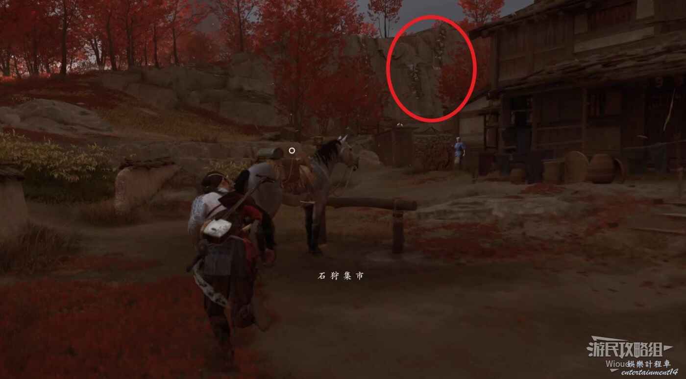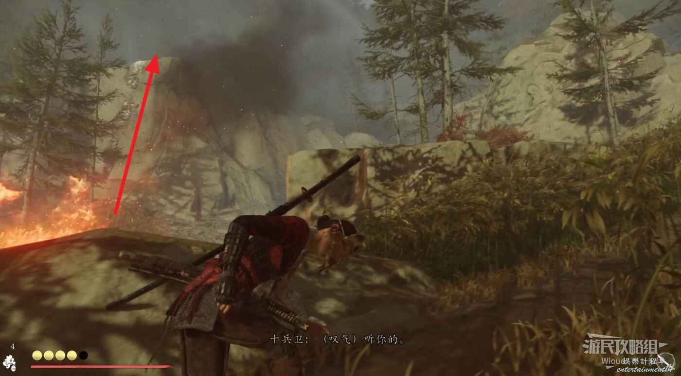 敵人逃進一片燒焦的森林後,下馬走路進去,爬左邊山壁上的攀附節點上去幹掉瘋五郎。