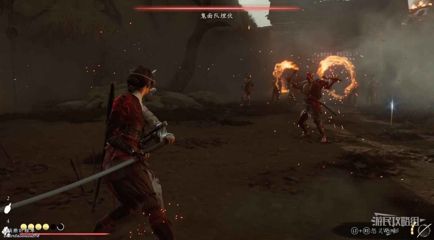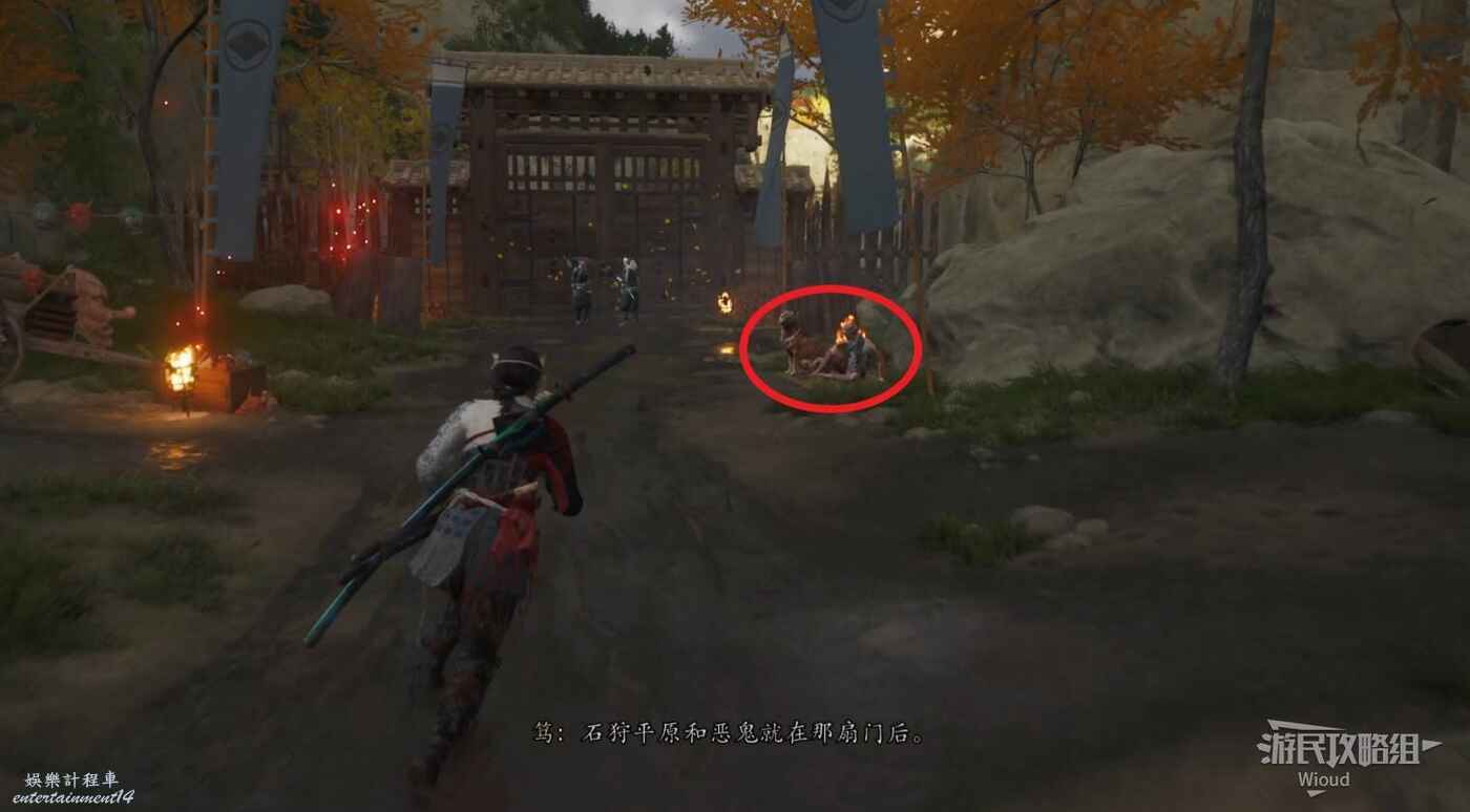 發現這裡被敵人襲擊,和有BOSS血條但小兵模組的鬼面隊埋伏戰鬥,將敵人全部幹掉打開大門。