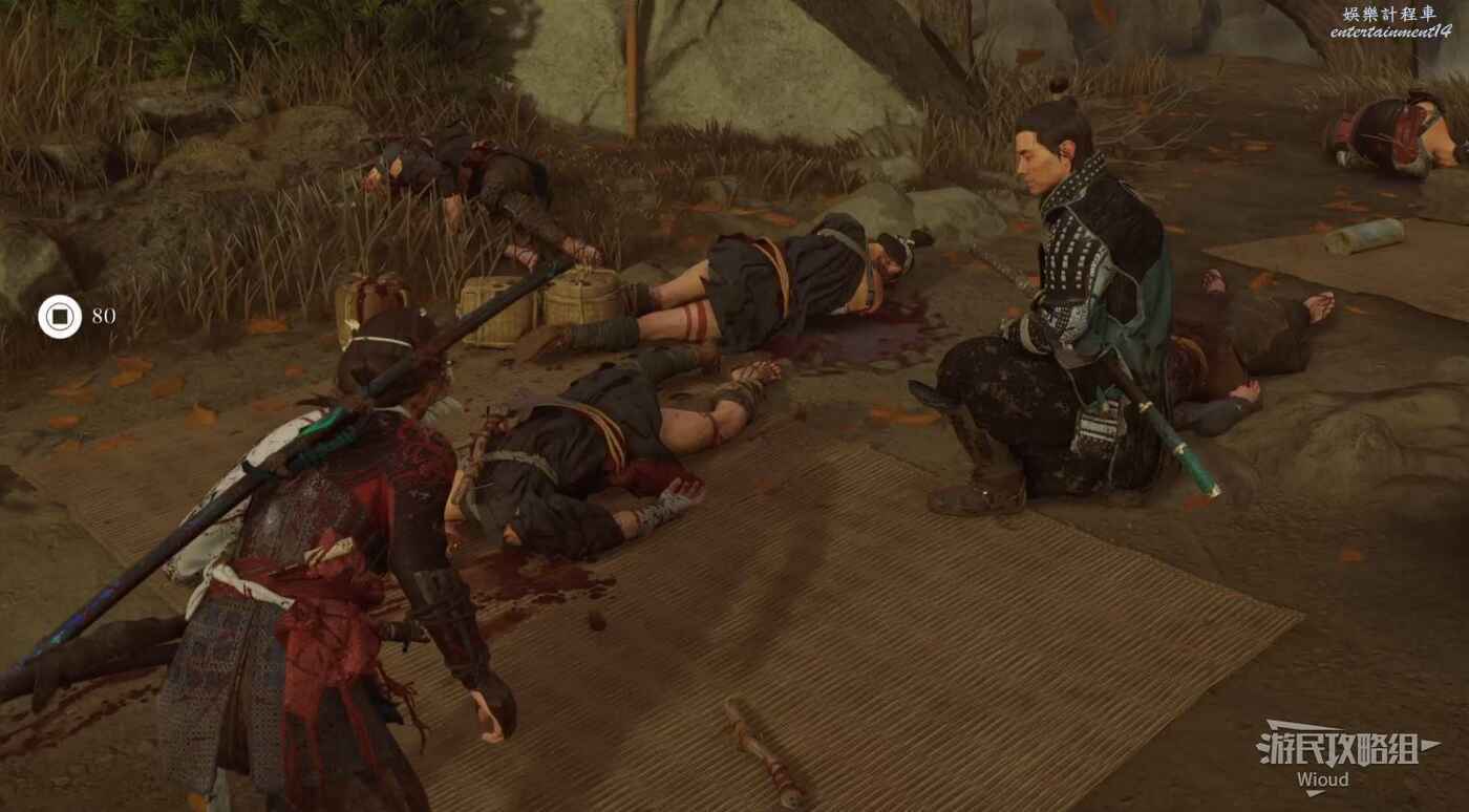 前方的路左拐再右拐,看到路上有不少屍體,跟著十兵衛檢查地面的屍體和瘋五郎的營地。
