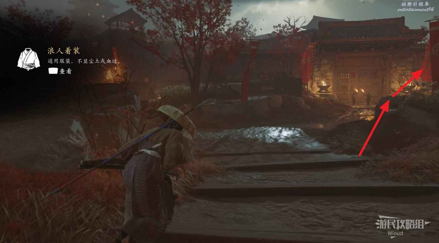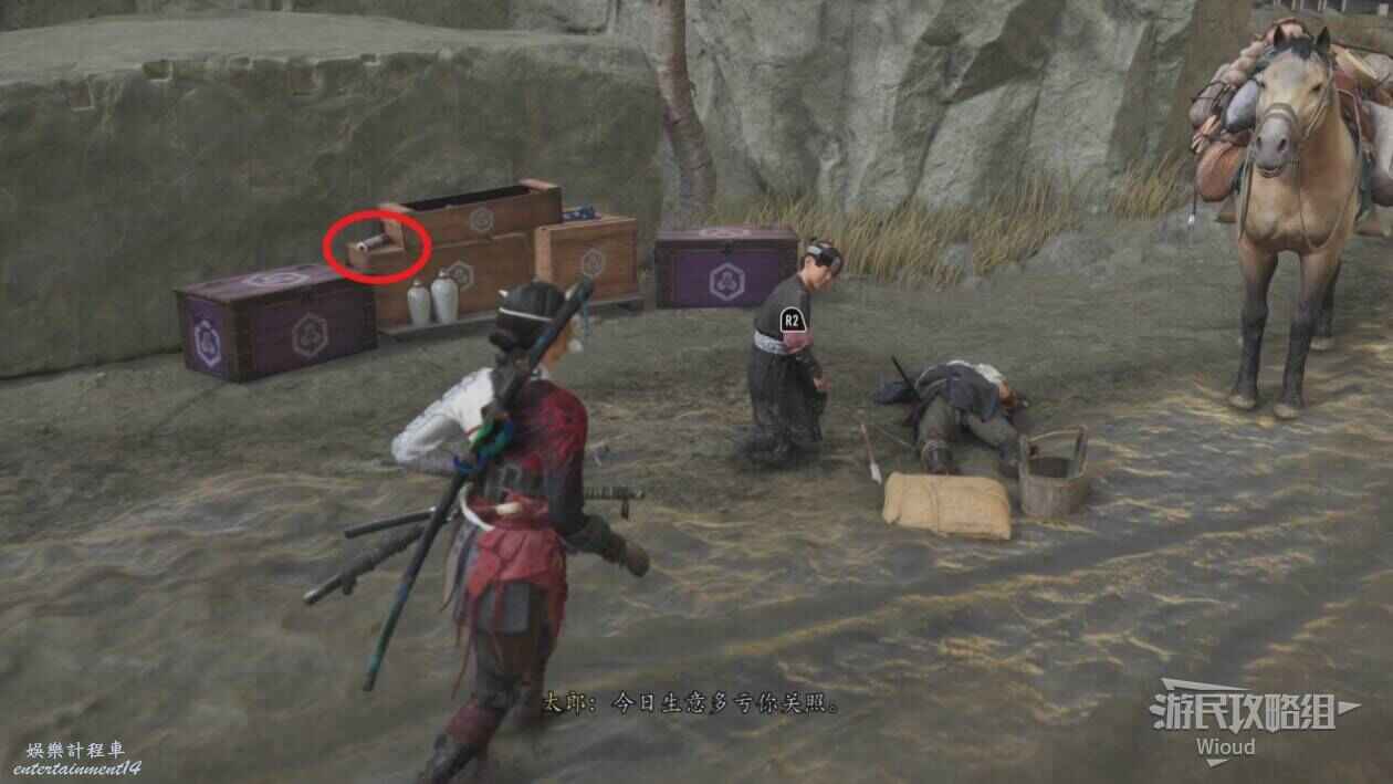過完劇情從大本營裡出來,先和遠處的馬互動拿回武器,並獲得服裝【浪人著裝】和【舊斗笠】。