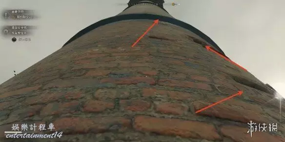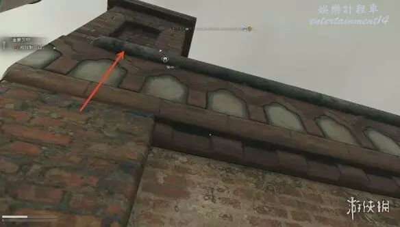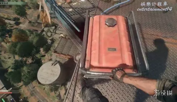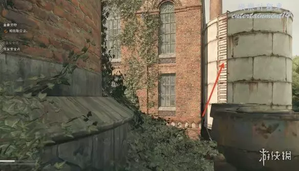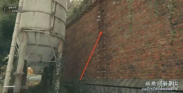 2、進入之後玩家面朝煙囪的位置,從牆上的梯子往上爬。跳到對面白色桶的位置,往上爬梯子。