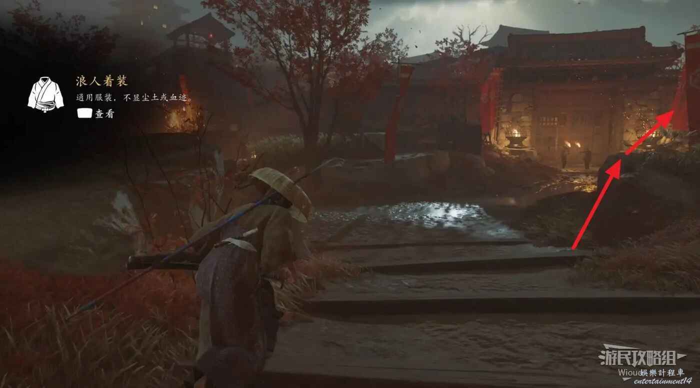 過完劇情從大本營裡出來,先和遠處的馬互動拿回武器,並獲得服裝【浪人著裝】和【舊斗笠】。