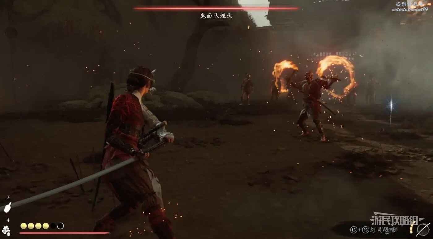發現這裡被敵人襲擊,和有BOSS血條但小兵模組的鬼面隊埋伏戰鬥,將敵人全部幹掉打開大門。
