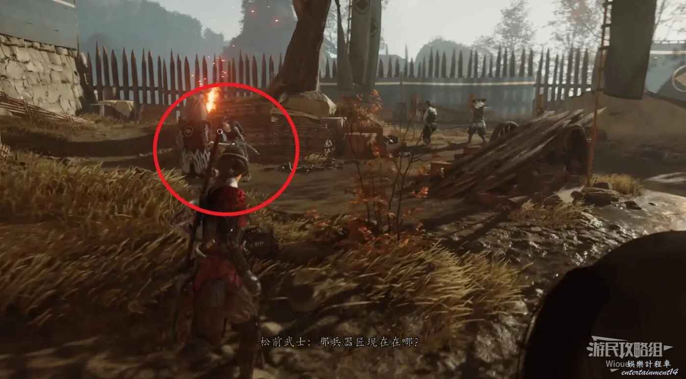 天亮和岔路的十兵衛對話(字幕的名稱從北守變為了十兵衛),跟著十兵衛走到松前家的營地前。