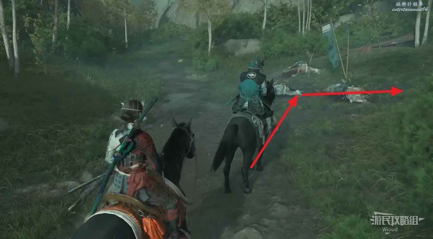 跟著他走,看見幾匹馬的屍體,和屍體互動然後往右走。