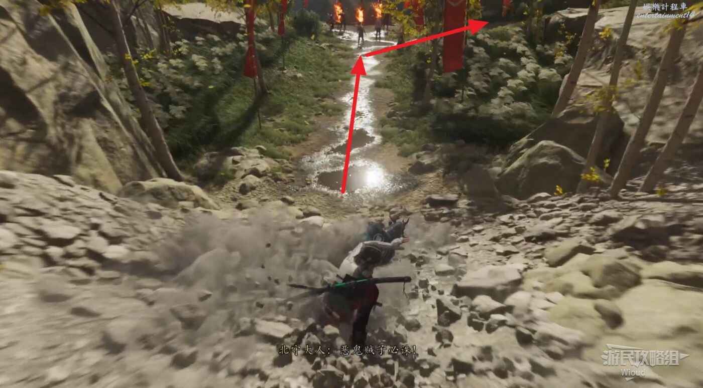 沿著地面的腳印走到山坡,沿著對面的攀附點往上爬,在頂端盡頭找到敵人。