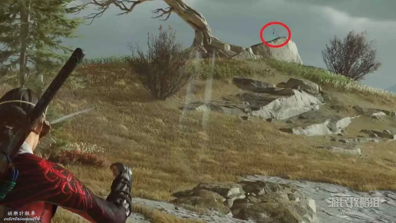 到達營地和說書人對話,然後擊敗前面的熊,拾取掛在樹上的風鈴。