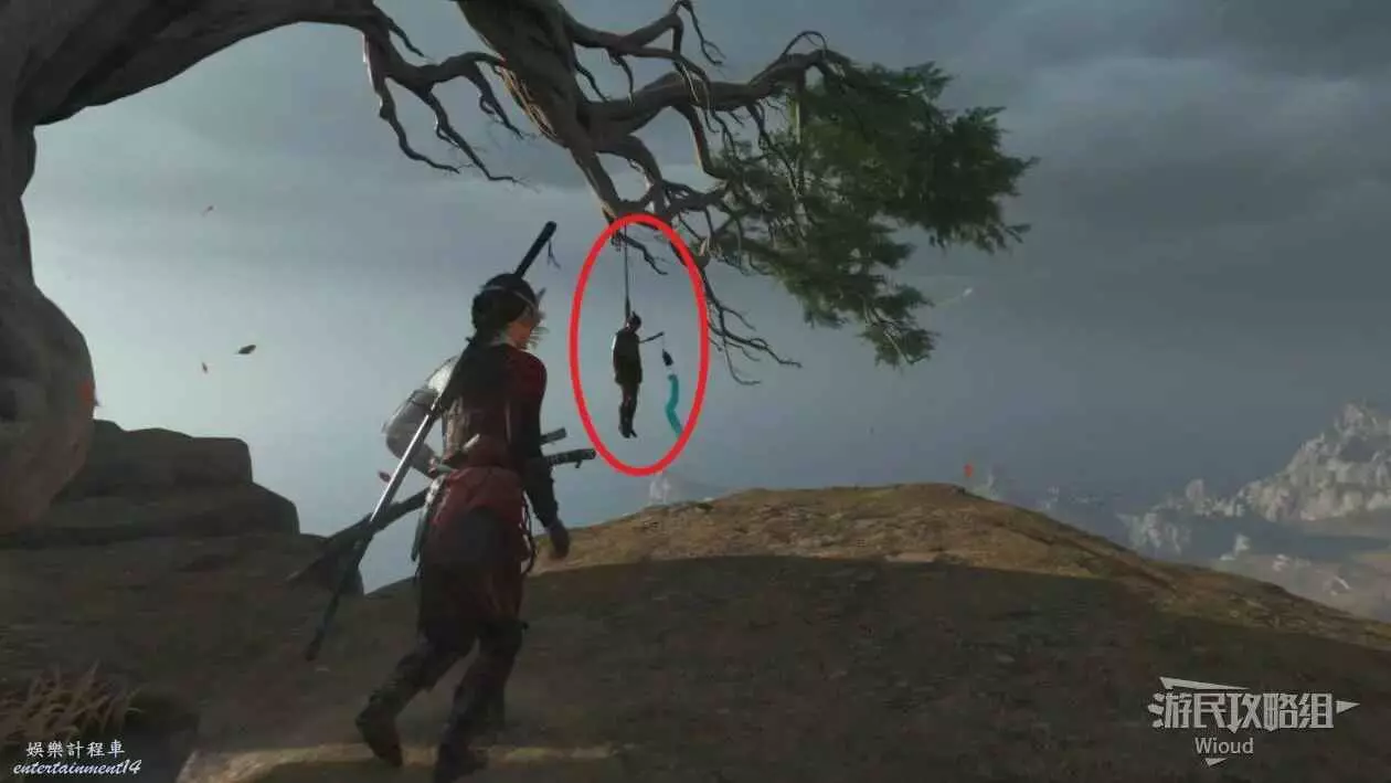 原路返回,在懸崖邊的樹杈和說書人對話,選擇【我擊敗了他】獲得一些錢幣獎勵。