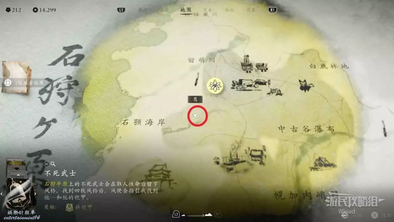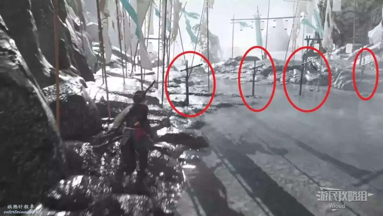 沿著洞穴裡面的路走到外側岸邊,將四個風鈴放到四個支架上,不死武士會出來跟我們呢對話。