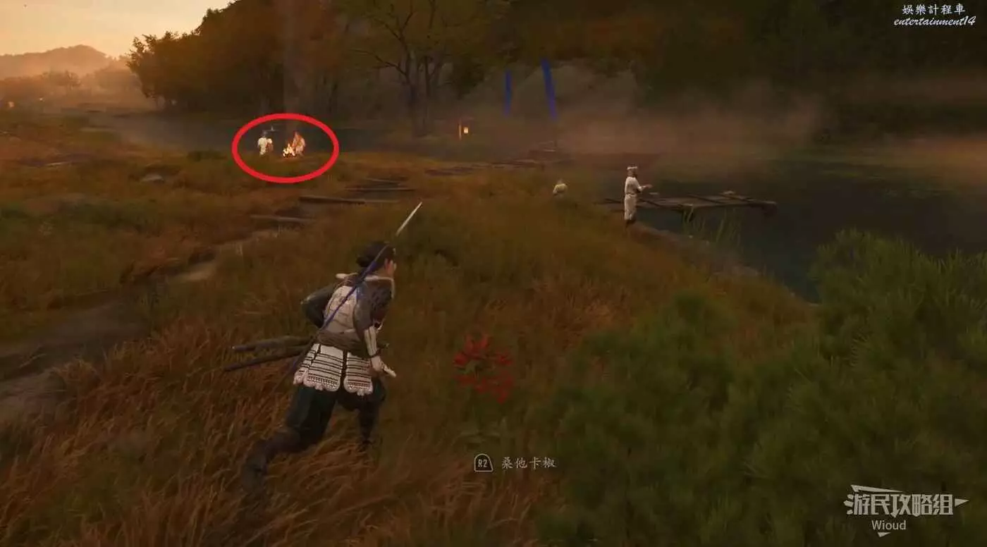 先沿著下圖路線走,貼著右側的攀附點移動到下方,跳到左側,然後往上爬到頂找到一個營地,營地寶箱可拿到服裝【赤援斗笠】。