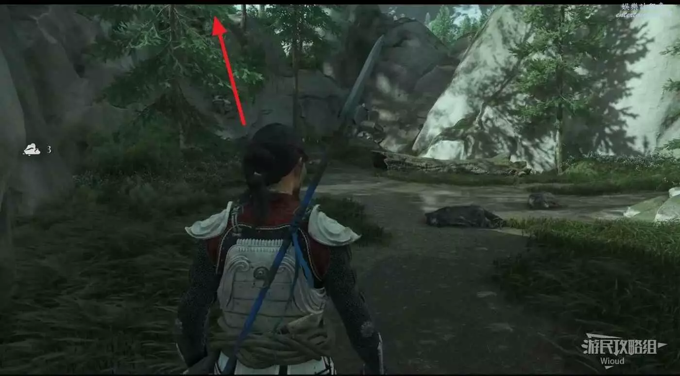 穿過一個牆縫看到一堆狼的屍體,沿著左側的節點爬上去往下走。