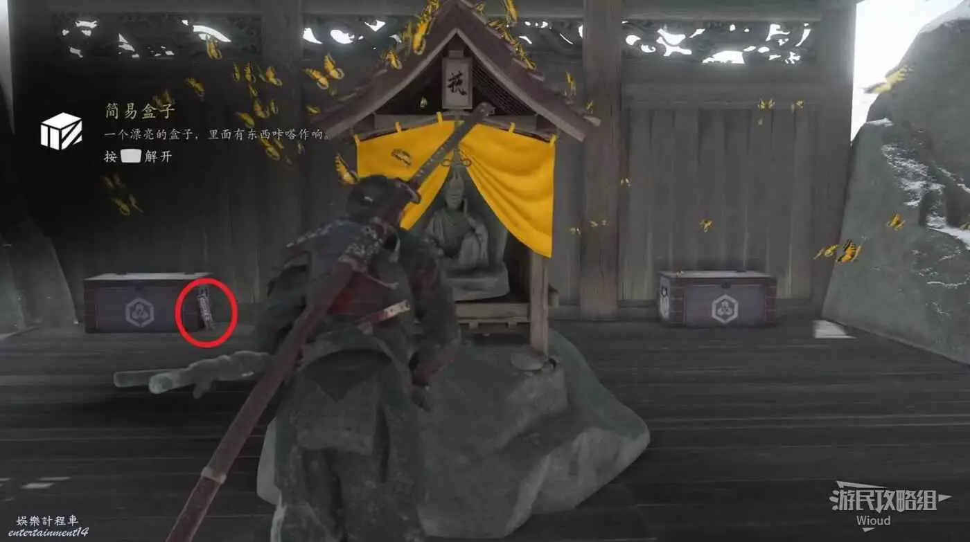 啟動祭壇,拾取【簡易盒子】,拾取左後寶箱旁的【論松前家】。