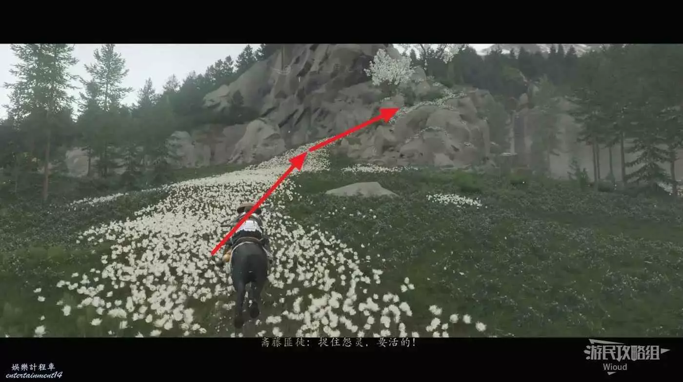 往地圖左下角指引區域移動,跟著白色花叢往山上走。