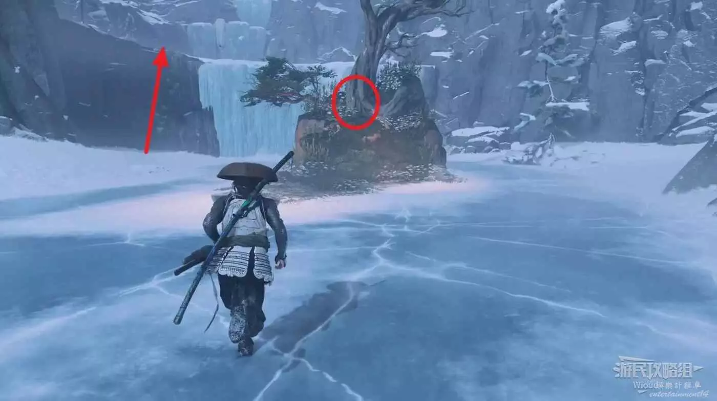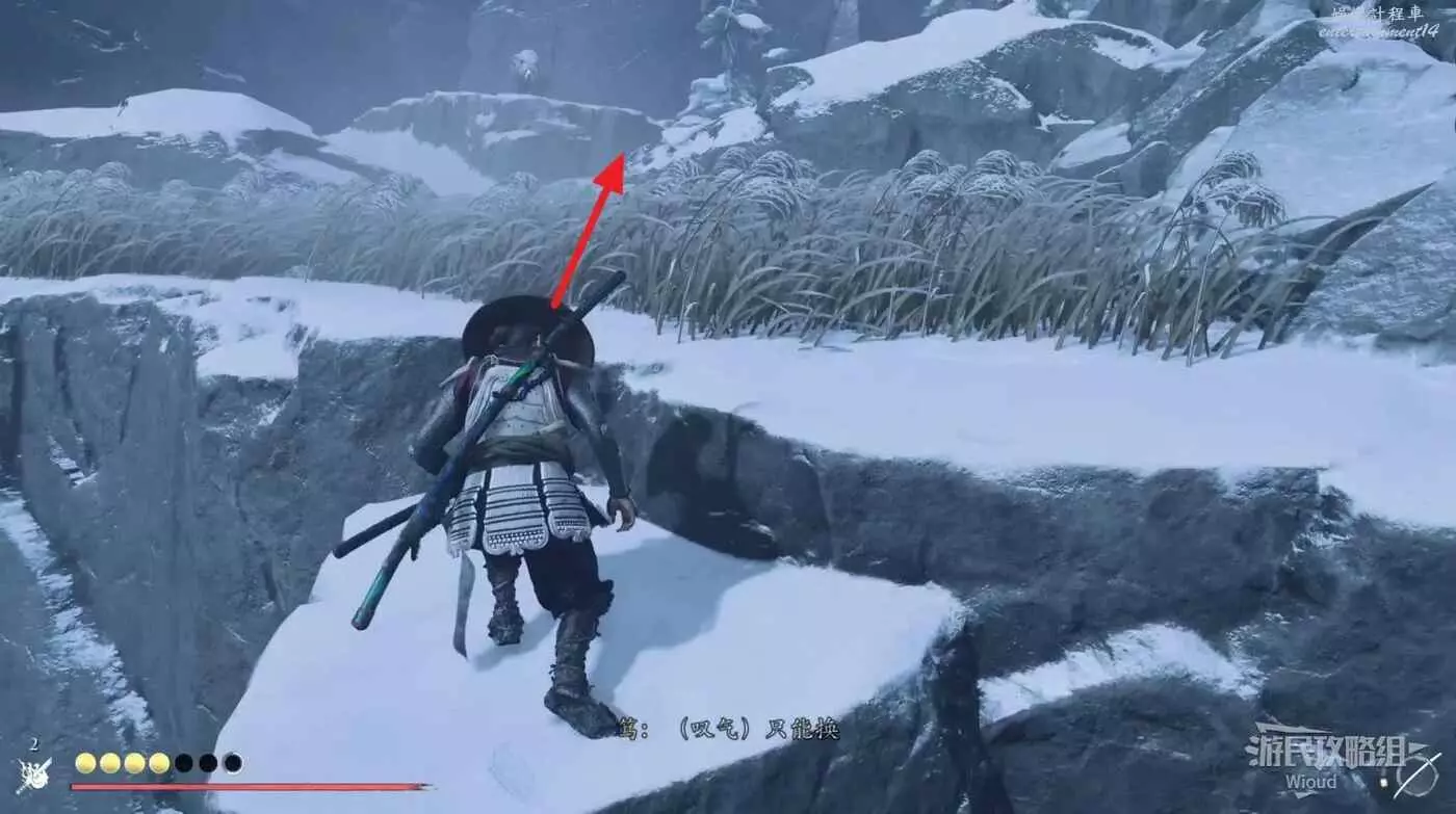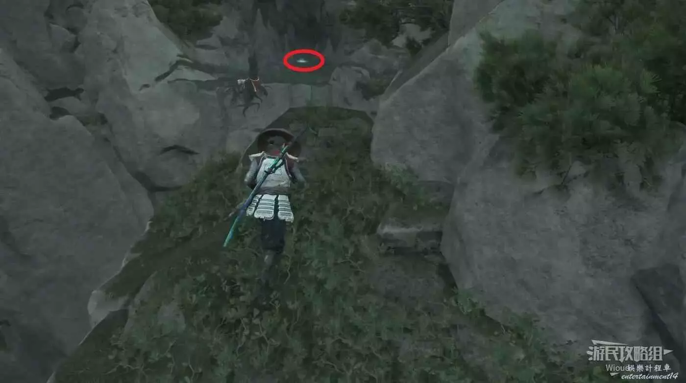 不遠處會看到一棵突兀的樹,樹旁拾取武器,然後爬左前方的攀附節點。