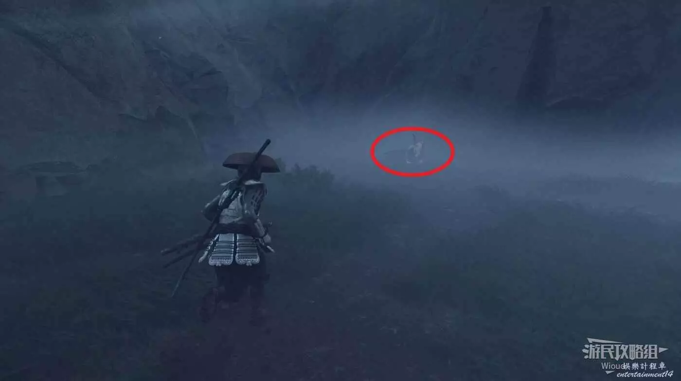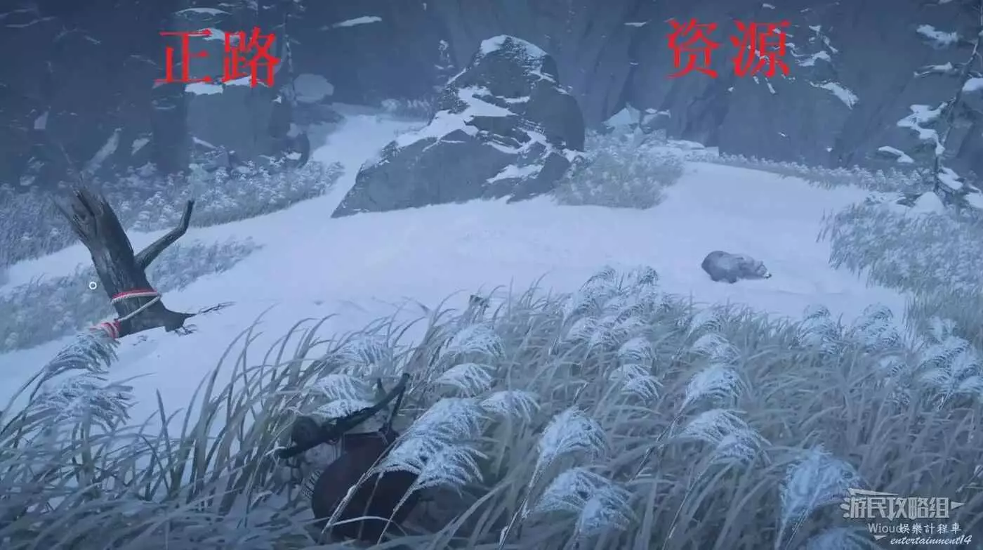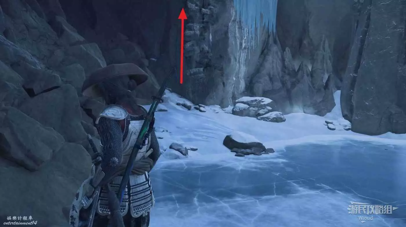 不遠處會看到一棵突兀的樹,樹旁拾取武器,然後爬左前方的攀附節點。
