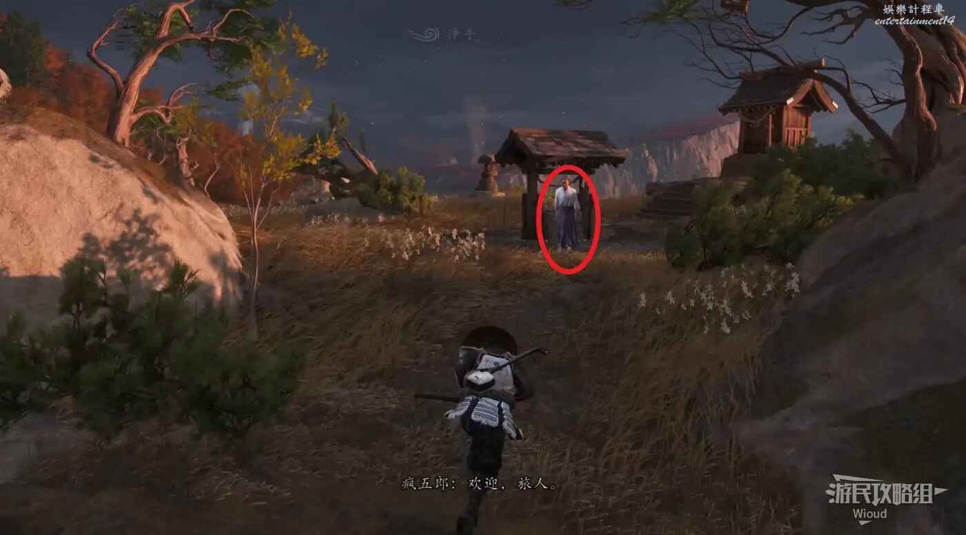 沿著跑路路線和十兵衛一起走到山頂,發現瘋五郎在這裡冒充神官。
