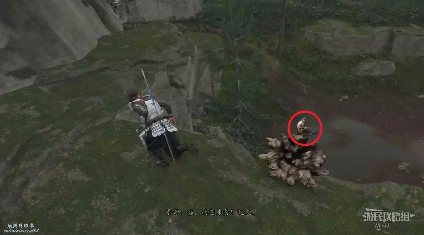 跟隨風的指引找到跌倒的任務發佈人,和她對話,跟著她走到攀附節點前。