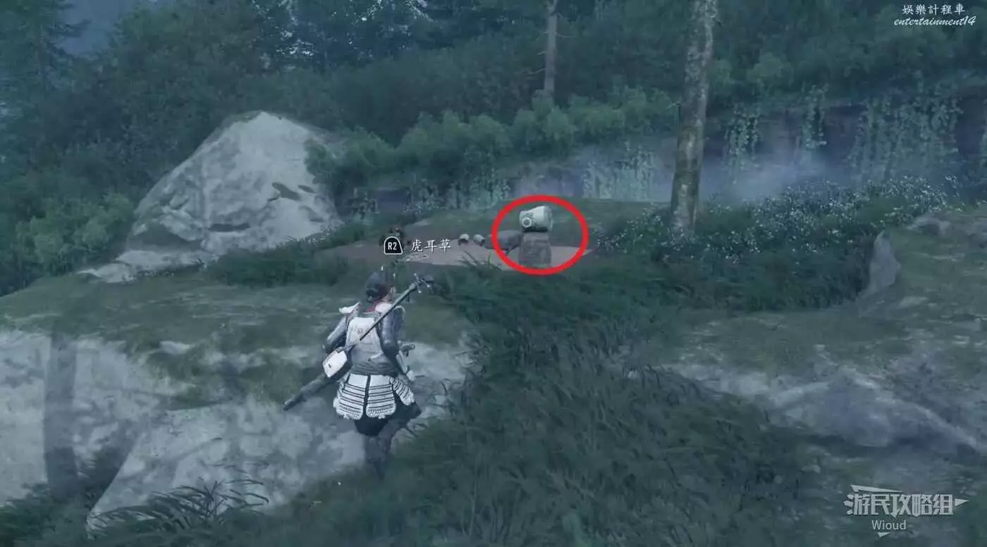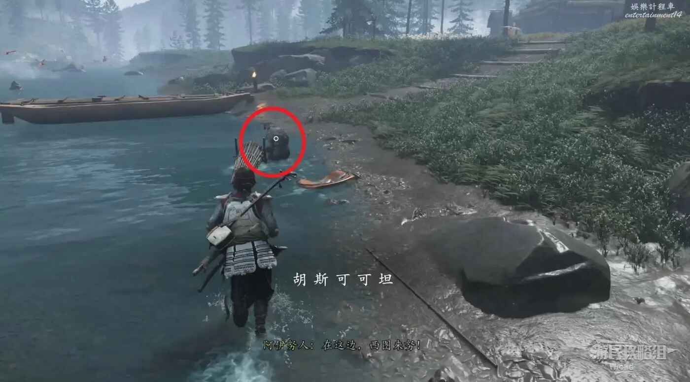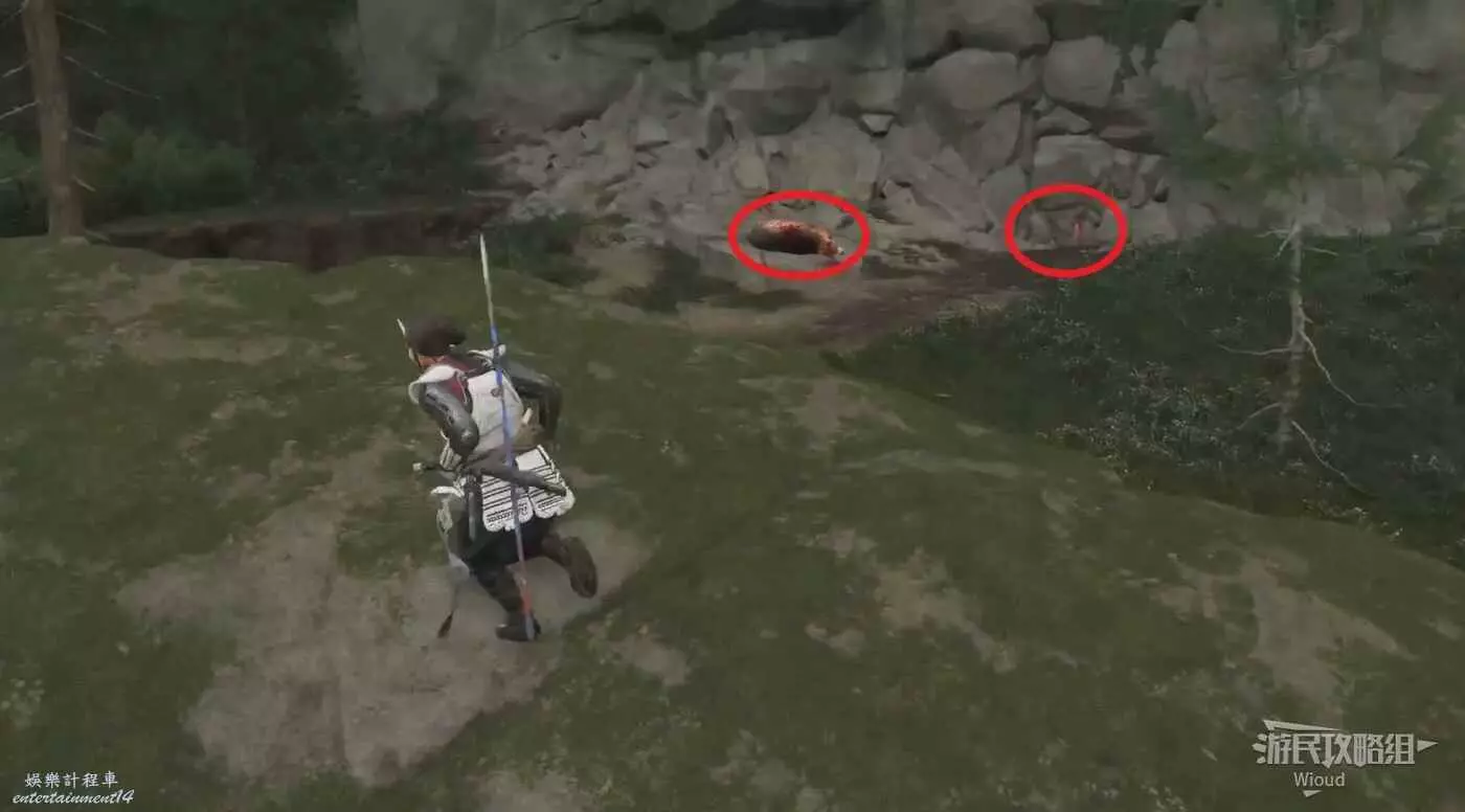 走到終點,看到一頭熊的屍體,先和熊互動,然後扒開右側的石塊。