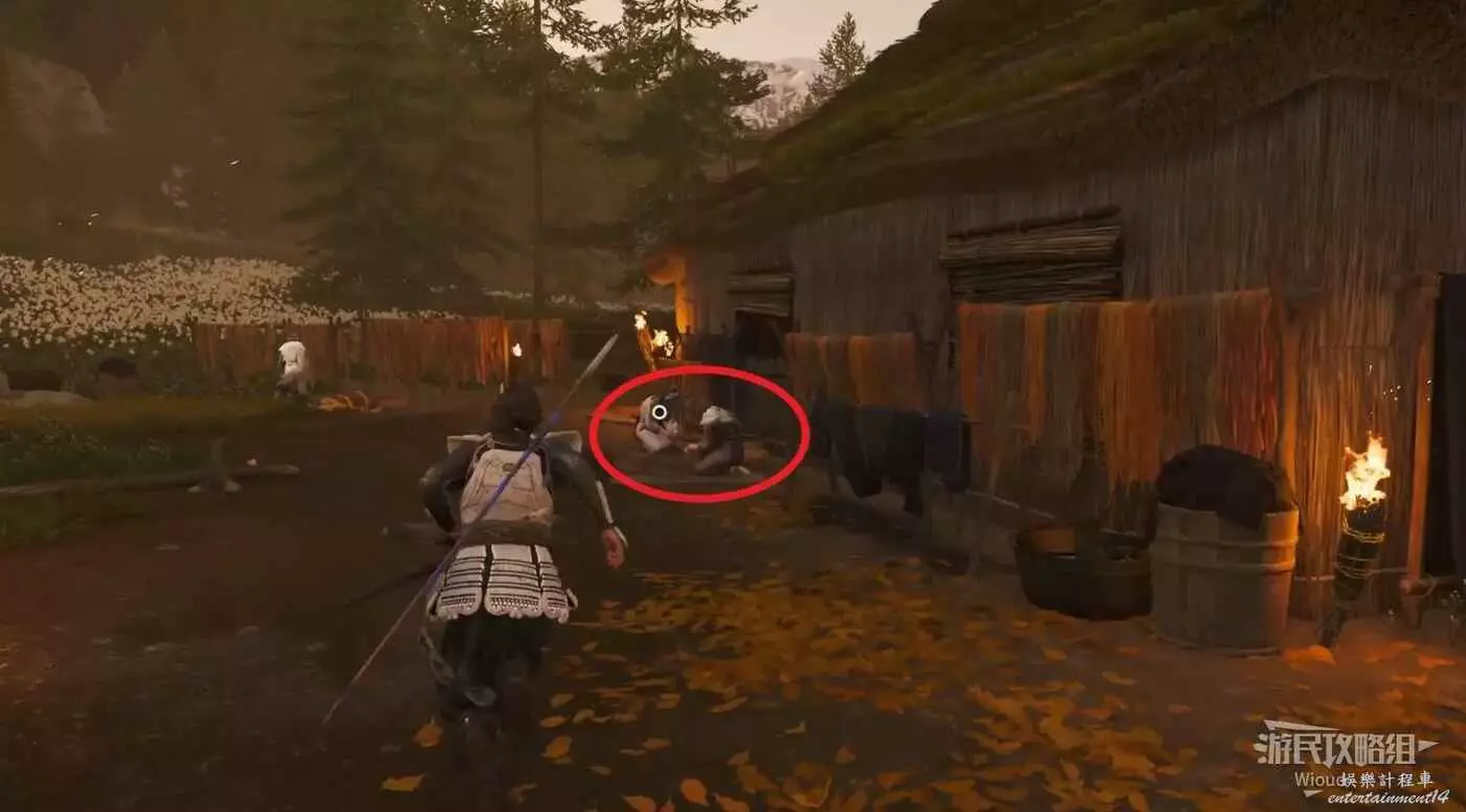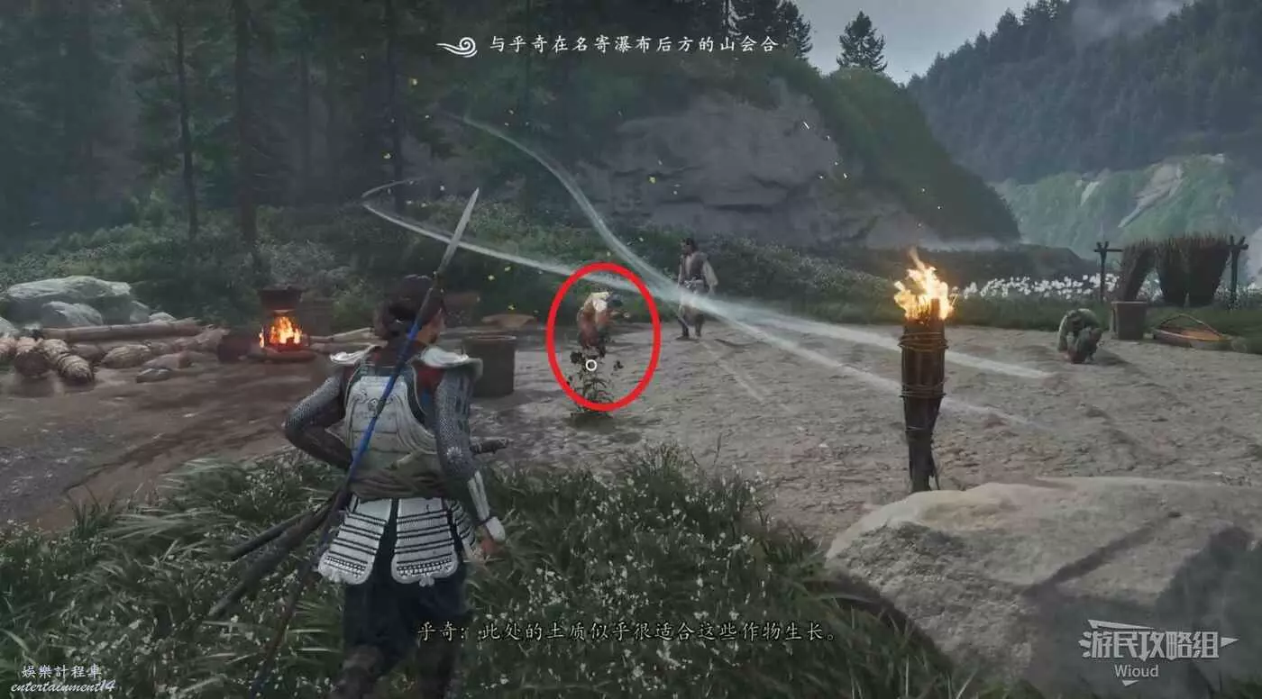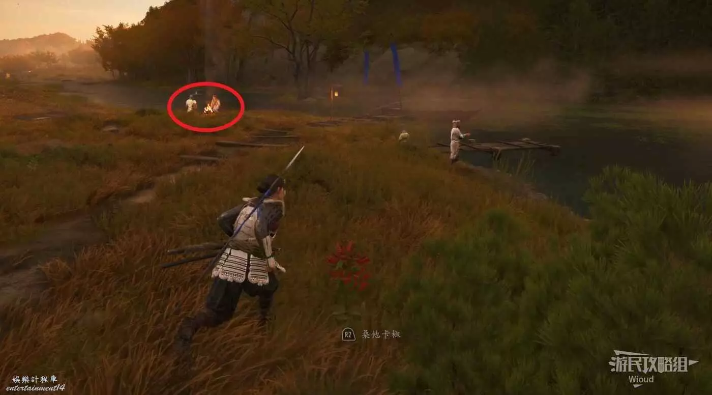 先沿著下圖路線走,貼著右側的攀附點移動到下方,跳到左側,然後往上爬到頂找到一個營地,營地寶箱可拿到服裝【赤援斗笠】。