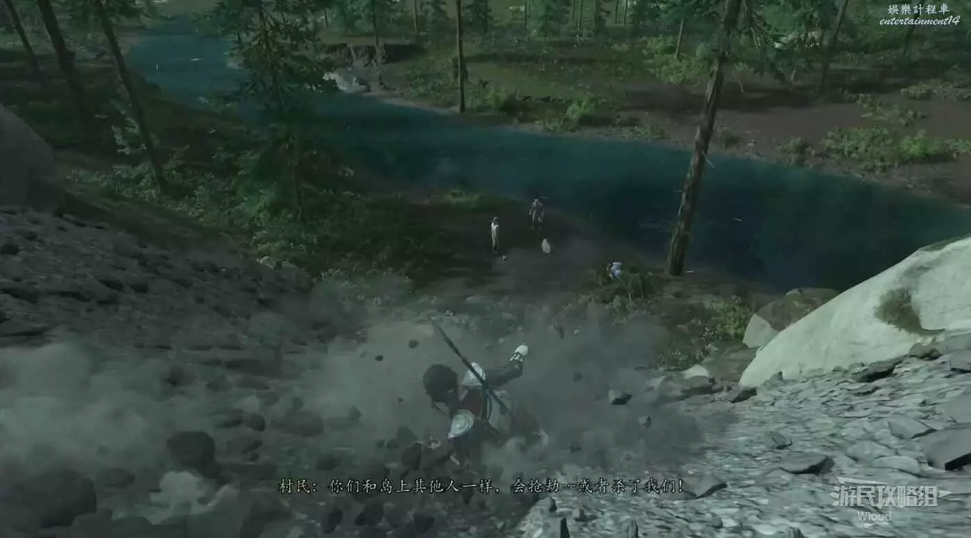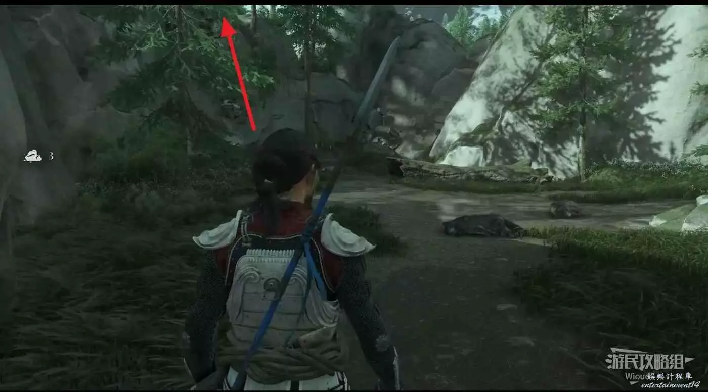 穿過一個牆縫看到一堆狼的屍體,沿著左側的節點爬上去往下走。