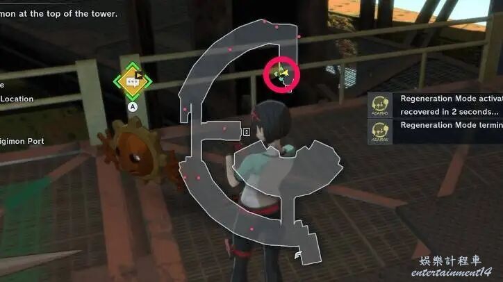 接受日輪獸的請求後,可使用其身旁的巴朵拉獸(Birdramon)直接飛往中央塔頂(Central Tower: Steel Point)。